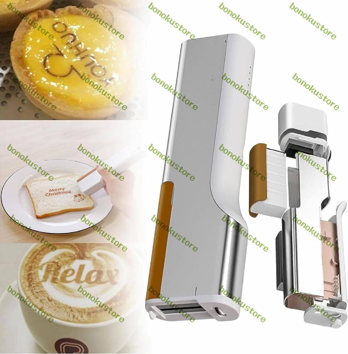 仕様; 製品名: フードプリンター 電力: 1200mAh、7.2V サイズ: 174mm*53mm*30mm (長さ*幅*高さ) 重量: 255G 色: フードブラウンインクカートリッジ プリントサイズ:26mm バッテリー:標準印刷2000回/1回の充電 精度: 300 DPI 充電方式:Type-C 本体材質:アルミニウム合金 梱包リスト: 1 * プリンター 1 * 位置決めプレート 1 *電源コード 1 *食品インク 1 * 取扱説明書