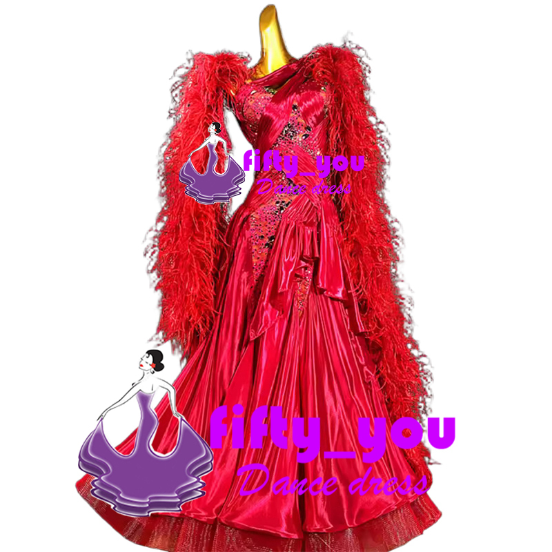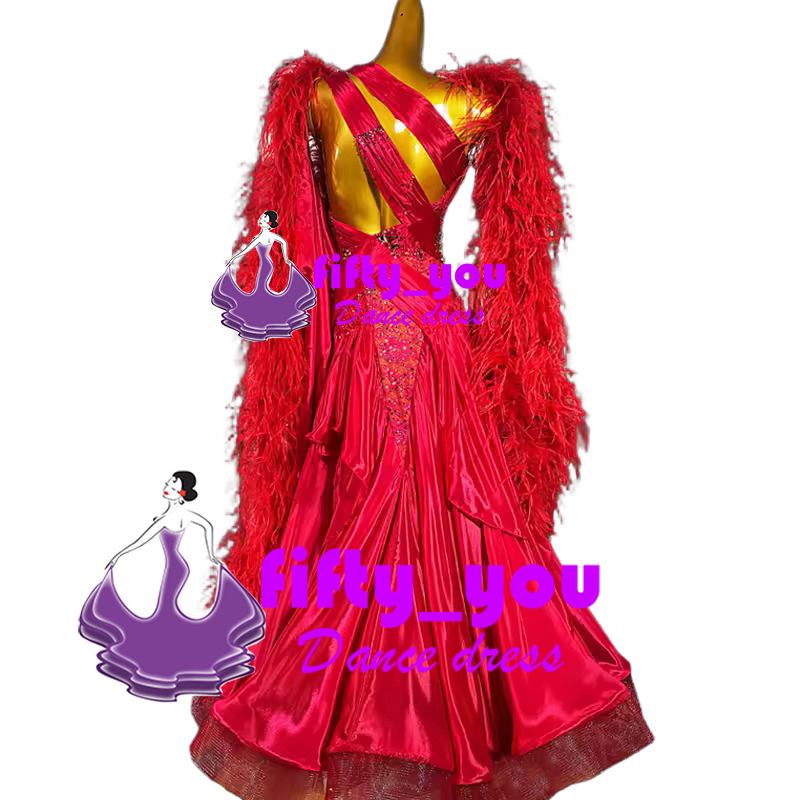 新品fifty_you レディース社交ダンスモダン競技ドレス セミオーダー スタンダードドレス  ボリュームファー付き 光沢付き生地