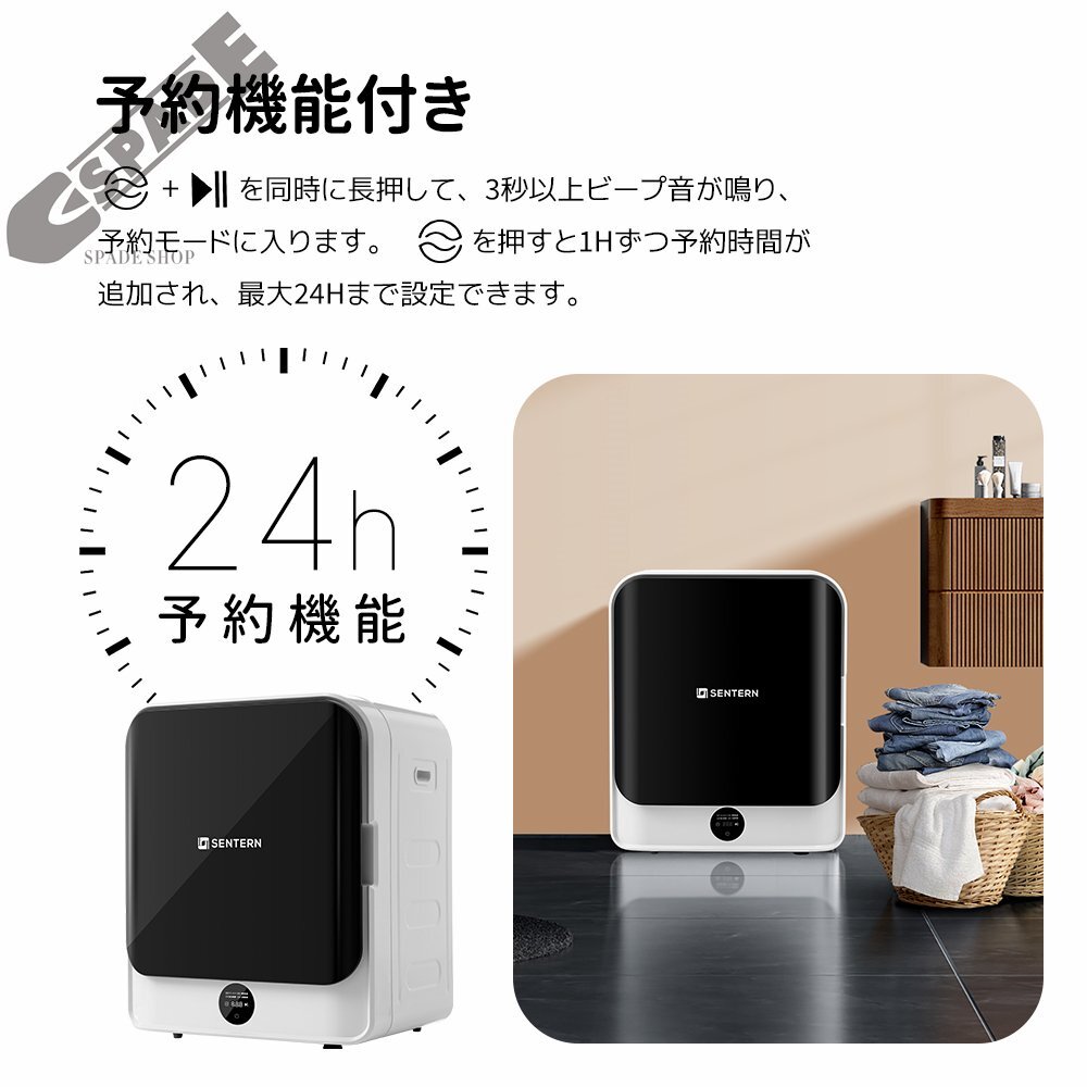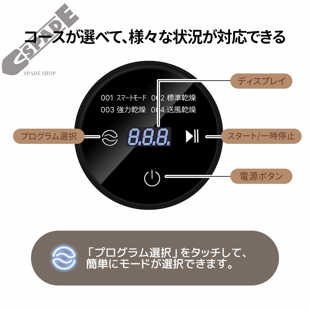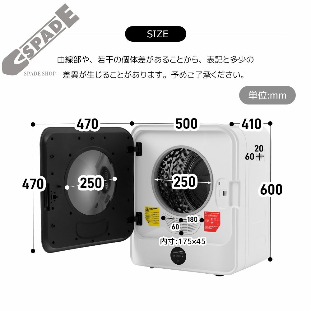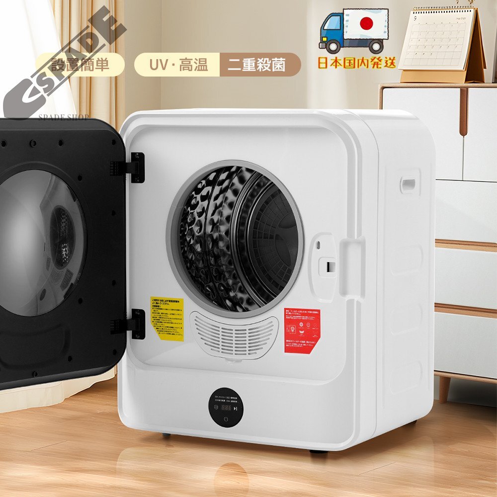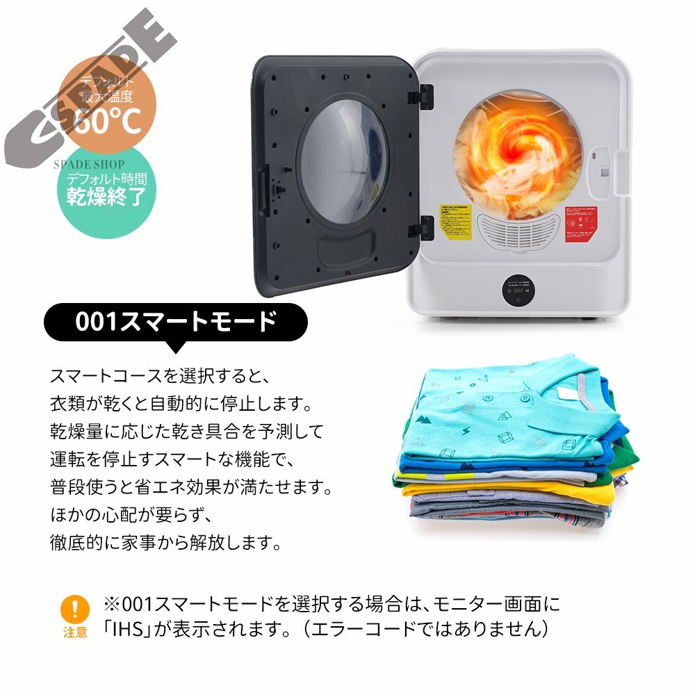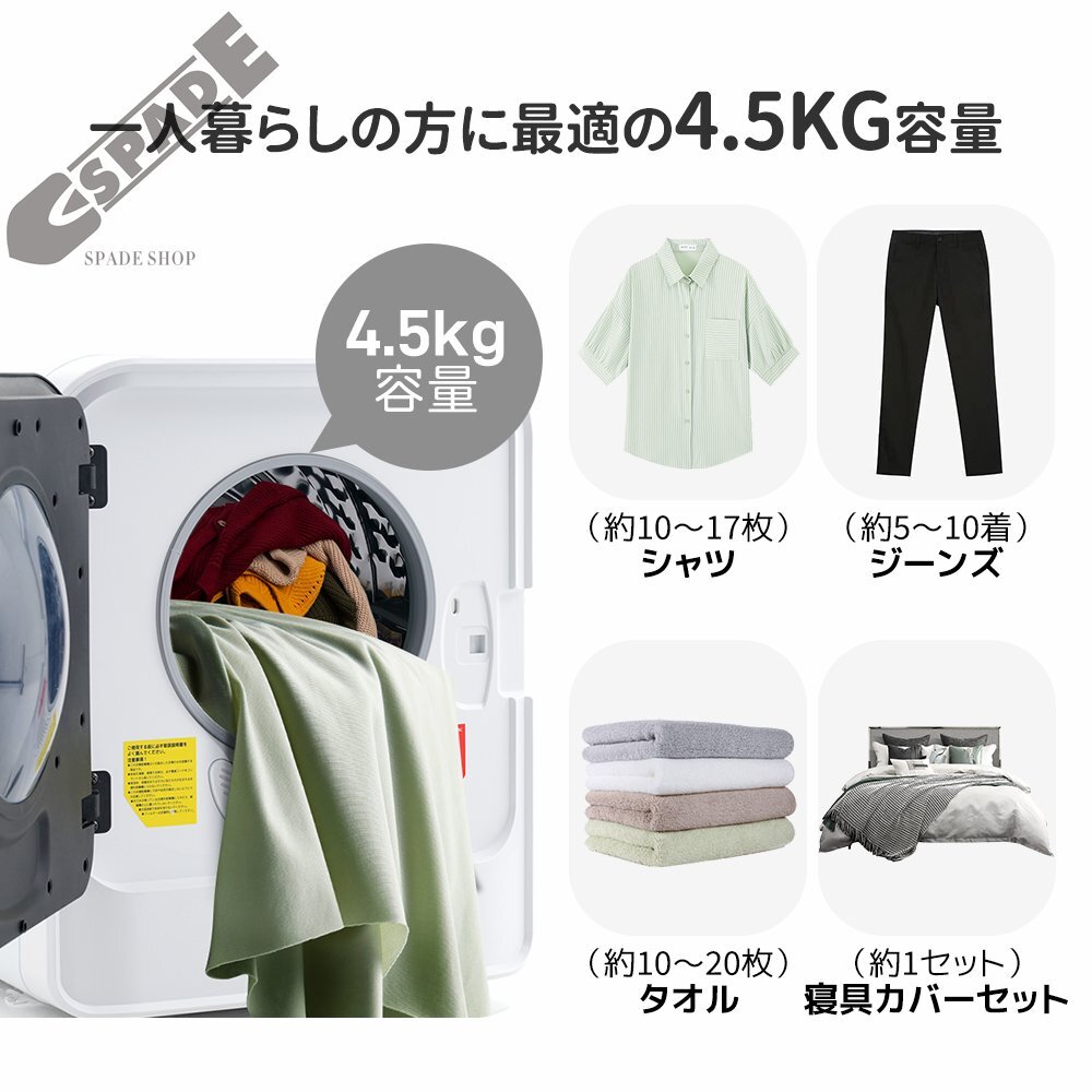 01一人暮らしに最適の4.5KG容量 シャツ(約10~17)ジーンズ(約5~10着)タオル(約10~20枚)寝具カバーセット(約1セット) ◆02美観と機能を兼ねてLED液晶ディスプレイ 高級感のあるデザイン性と見やすいLED液晶ディスプレイで 時間、運転コースはー目瞭然です。 ◆03コースが選べて、様々な状況が対応できる 「プログラム選択」をタッチして、簡単にモードが選択できます。 001スマートモード スマートコースを選択すると、衣類が乾くと自動的に停止します。 乾燥量に応じた乾き具合を予測して運転を停止すスマートな機能で、普段使うと省エネ効果が満たせます。 ほかの心配が要らず、徹底的に家事から解放します。 デフォルト時間:乾燥終了  デフォルト最大温度:60℃ ※ご注意:001スマートモードを選択する場合は、モニター画面に「IHS」が表示されます。(エラーコードではありません) 002標準乾燥 綿衣類、シーツなどを乾燥する時はこちらのモードをおすすめします。 デフォルト時間:90分 デフォルト最大温度:60℃ 003強力乾燥 大きな綿衣類、シーツなどを高温で乾燥します。高温除菌効果も期待できます。 デフォルト時間:150分 デフォルト最大温度:60℃ 004送風乾燥 優しい温風で衣類を吹きます。 シルク、ウールなど熱に弱い衣類にはこちらのモードをおすすめします。 毎日着るようなワイシャツやブラウスなど、シワを目立たせたくないモノを乾燥させるときにも、あると嬉しい機能です。 デフォルト時間:20分 ◆04シワ残りを防ぐ 手間軽減 衣類を乾燥させる以外にシワ取り機能を搭載してます。運転終了時の衣類のシワを軽減することでアイロンがけ時間を短縮でき、タオル類もふんわりと仕上げることができます。アイロンをかける手間が省けるので家事の負担を軽減できます。 ◆05予約機能付き 予約タ機能を搭載し、朝の起床時間や、仕事からの帰り時間に合わせて乾燥を完了できて便利です。 ◆06UV・高温の二重殺菌 家族の健康を守る 温度が20℃になると、自動的にUV殺菌 衣類をUVで照射して、徹底的に除菌でき、室内で干す際も「日光消毒」の効果があります。いつでも清潔な衣類を手に入れることができます。 温度が60℃になると、デフォルト高温殺菌 外干しや日光消毒でも除去できない二オイを取り除きます。生乾き臭の心配もありません。 ◆07寝ている間も稼働音が気になりにくい「静音設計」 静音設計を採用しています。夜中や早朝など、時間を選ばず運転させたい方に最適です。また赤ちゃんのいるご家庭にもおすすめです。 普段よりも稼働中の音を静かにしてくれるため、就寝中も音が気になりにくいのが魅力です。 ◆08安全安心のストップ機能 運転途中でドアを開けたときは運転が一時停止されます。子供のやけどといたずらも防止できます。 小さなお子様のいるご家庭でもご使用いただけます。 ◆09絡まり軽減 逆回転と省エネ効果 ドラムは時計回り、反時計回り各方向に回転ように設計されます。逆回転を行うことで衣類の絡まりやもつれを軽減、短時間で均一な乾燥を実現します。均一な乾燥はだけでなく、省エネ効果も生み出し、エネルギーの無駄使いを抑えます。 ◆10 3層フィルターでホコリを低減 フィルターで落ちた髪、ペットの毛、花粉など綺麗に取り除けます。 取り外せ簡単なので、お手入れも簡単です。 乾燥フィルターは使うたびにお手入れをしないと、乾燥性能を十分に発揮できなくなるだけでなく故障の原因にもなり得ます。 内フィルターを損傷しないよう丁寧に掃除してください。 ◆11 ステンレスドラム ドラムは保温効果が高くと錆びもにくいステンレス製なので、機能性と耐久性の両方が兼ね備わっています ◆12特別な見た目 余計な装飾がなく、光沢のある純白外装と黒のドアはシンプルで、部屋をモダンな印象を与えます。 ◆13コンパクトで設置が簡単 重ね式 放置式 壁かけ式(※壁掛け部品を付属しておりません。壁掛け設置は専門業者様へご依頼ください) ◆14PSE認証済み 本製品はPSE取得しており安全性と信頼性を確保した製品です。