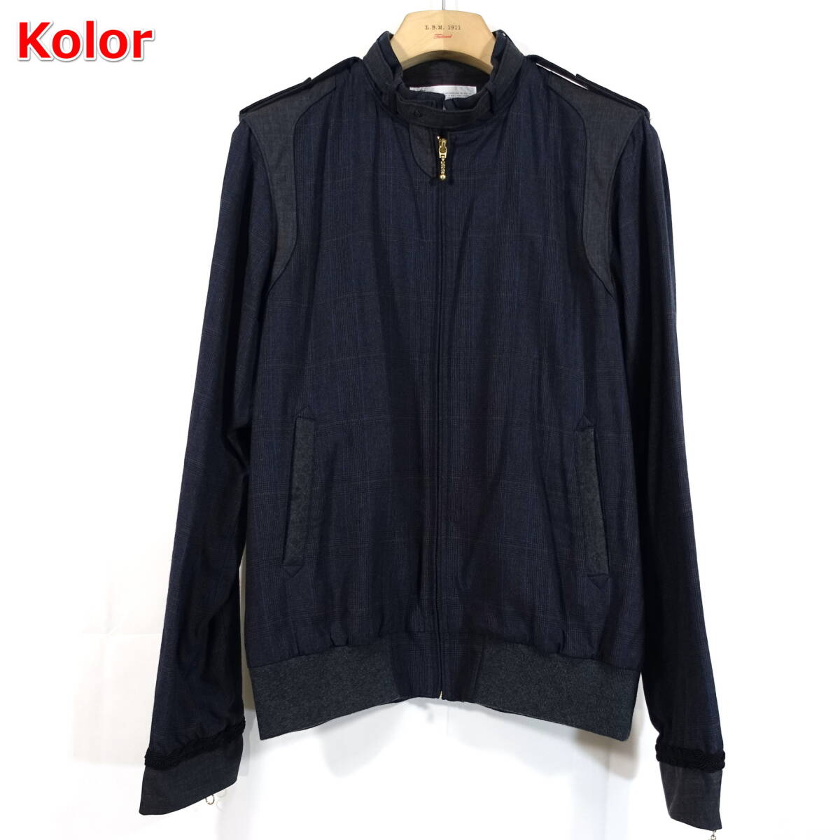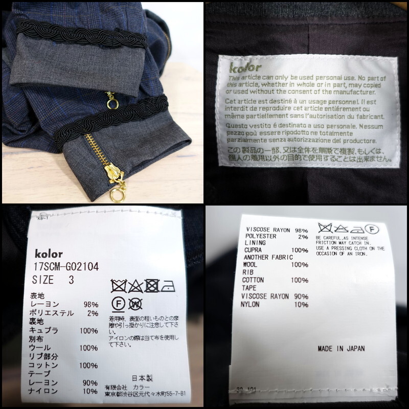 【良品】kolor チェック柄 シングルライダースジャケット カラー サイズ3 ネイビー