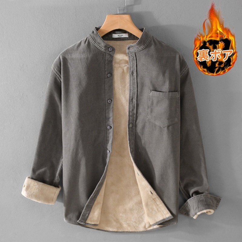 裏フリース 長袖シャツ トップス 裏ボア裏起毛 メンズ・新品 コーデュロイ シャツジャケット ブルゾン ワークシャツ【Y9433】濃いグレー L