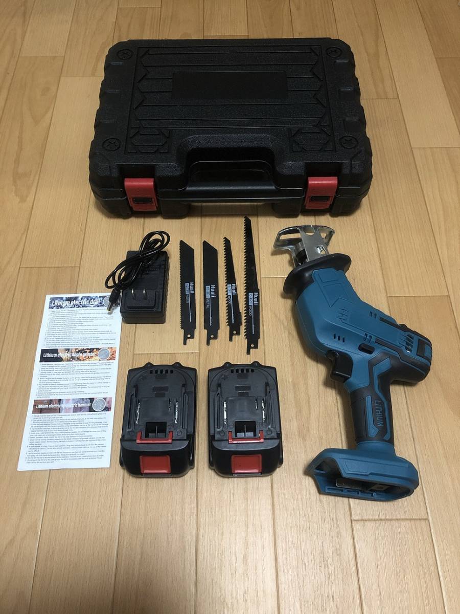 本体、大容量バッテリー2個(21v,2000mah)、専用ケース、充電器、レシプロソー替刃4本、説明書。(写真最後一枚全てです)