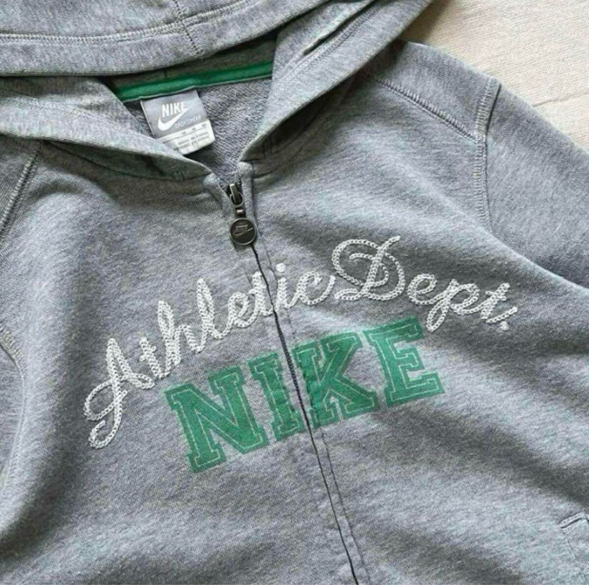 フロント胸元に落とし込まれたアスレチックアーチロゴ刺繍、グリーンのブランドロゴプリントと両サイドのステッチライン、右袖口のワンポイント・スウッシュ(スウォッシュ)ロゴ刺繍がポイントになったグッドデザイン。