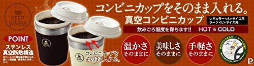 商品紹介 ホットコーヒーのレギュラーサイズに対応。 より ●コンビニカップをそのまま入れる。あたたかさそのままに、手軽さそのままに ●コンビニカップのレギュラーサイズにピッタリ ●車のドリンクホルダーにピッタリ収まるので、車内でも安定してコンビニカフェを楽しめる ●冷たいものは保冷だけでなく、カップの外側についた水滴からも周りが濡れるのを防ぎます ●ステンレス真空断熱構造により熱伝導が抑えられ、優れた保温性・保冷性を発揮 ●食器洗い乾燥機使用不可 ●電子レンジ不可