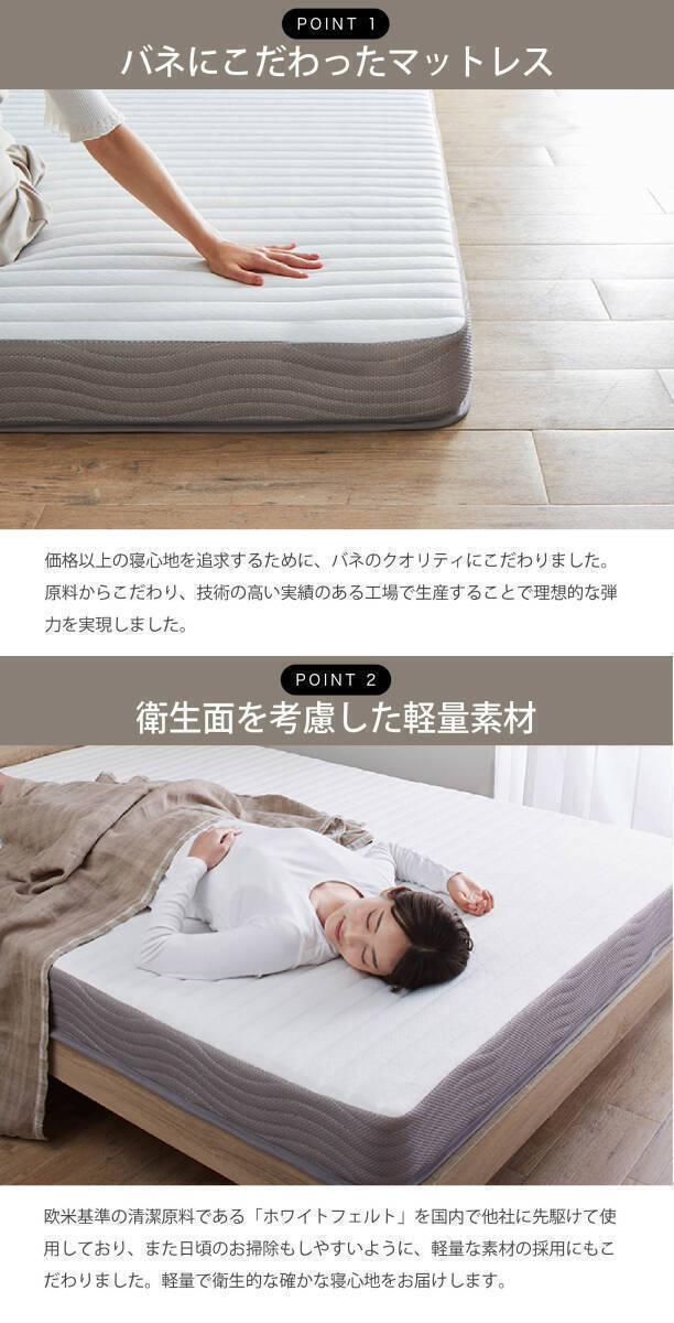 通常のマットレスと比べより軽量なマットレスです。掃除やローテーションがしやすいので衛生面でも優れています。こだわりのスプリングコイル、ホワイトフェルトの採用など随所にこだわりを盛り込みました。