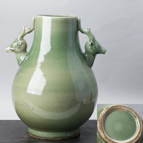 | 古い青磁の花瓶。箱無。 サイズは、幅約33x28cm、高さ約39cm。 傷・直しありません。 状態、詳細は画像でご確認ください。 |