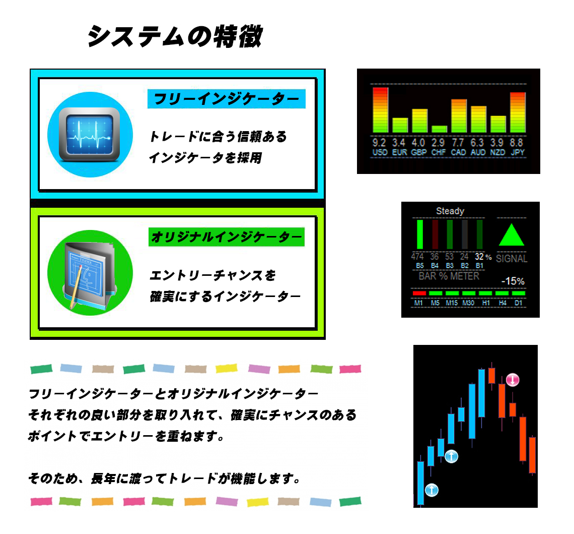 私の投資法は至ってシンプルですが勝率良く勝てます。MT4には様々なインジケーターのテクニカルが存在します。その中から何百通りも検証し、私のトレード手法に合うものを開発・組み合わせています。裁量は必要なく無裁量であり、マーチンやナンピンもありません。