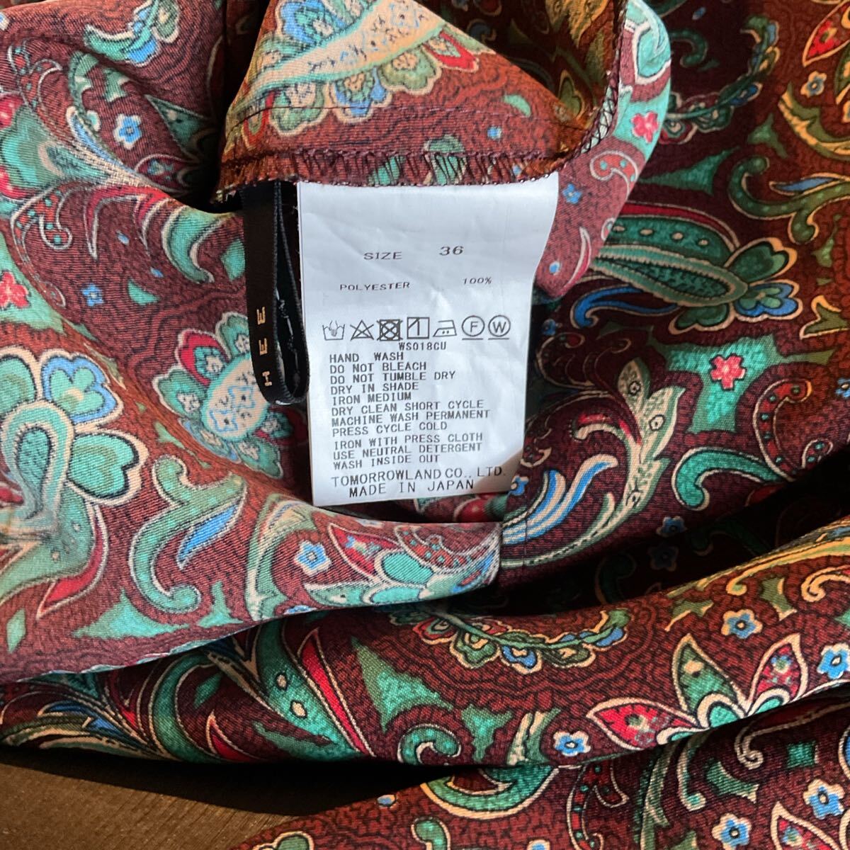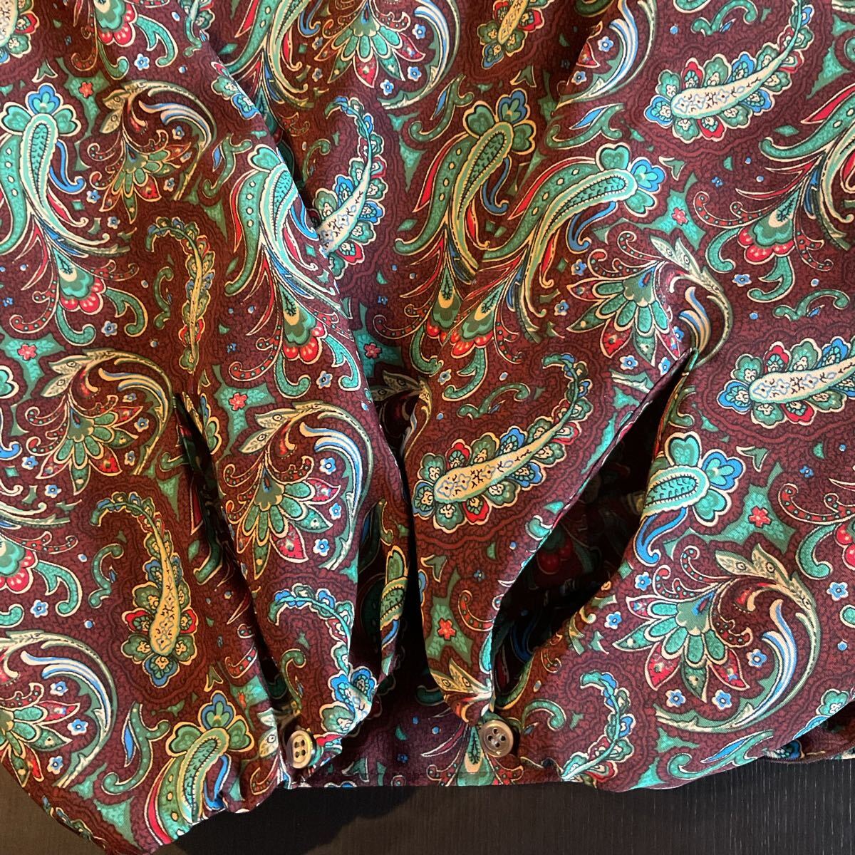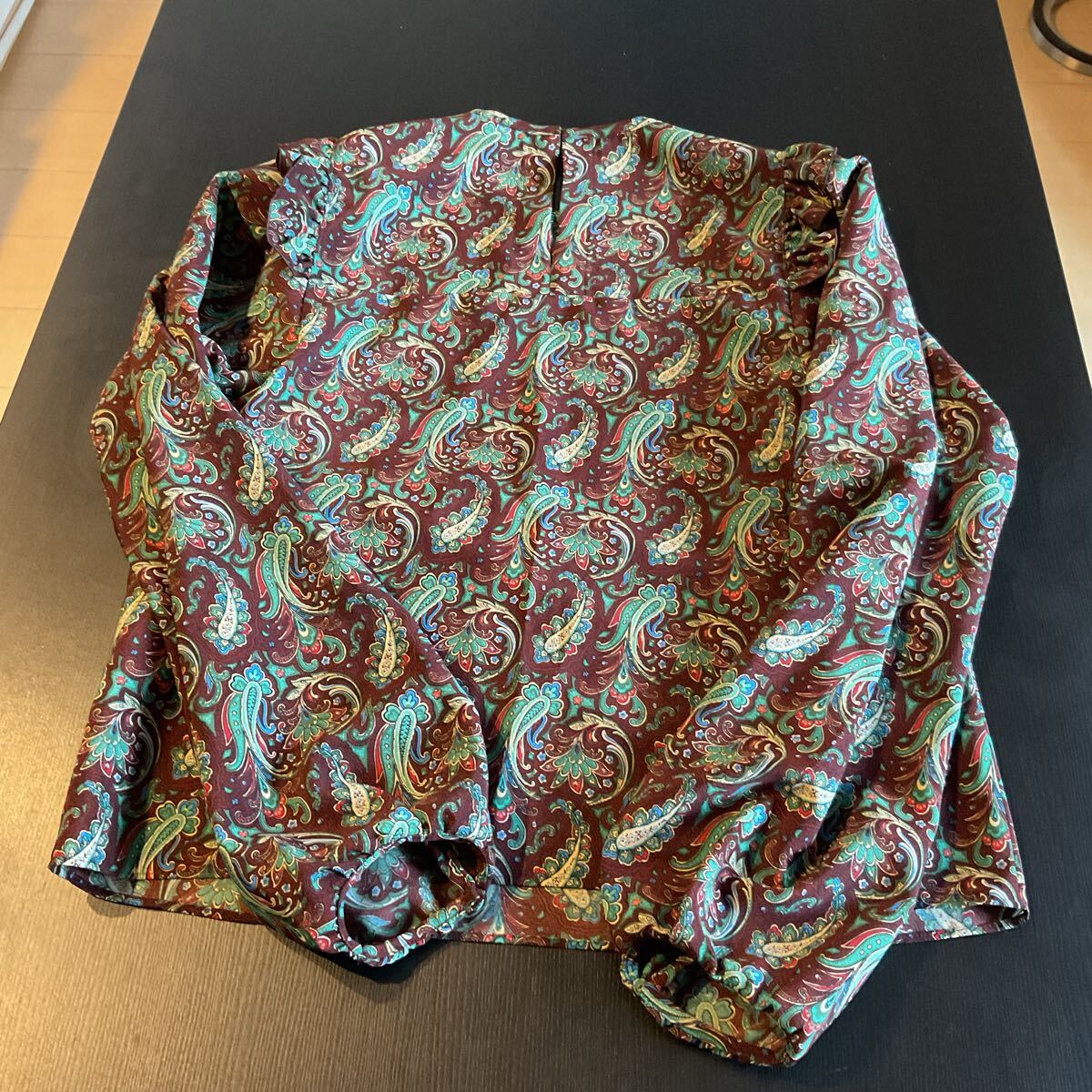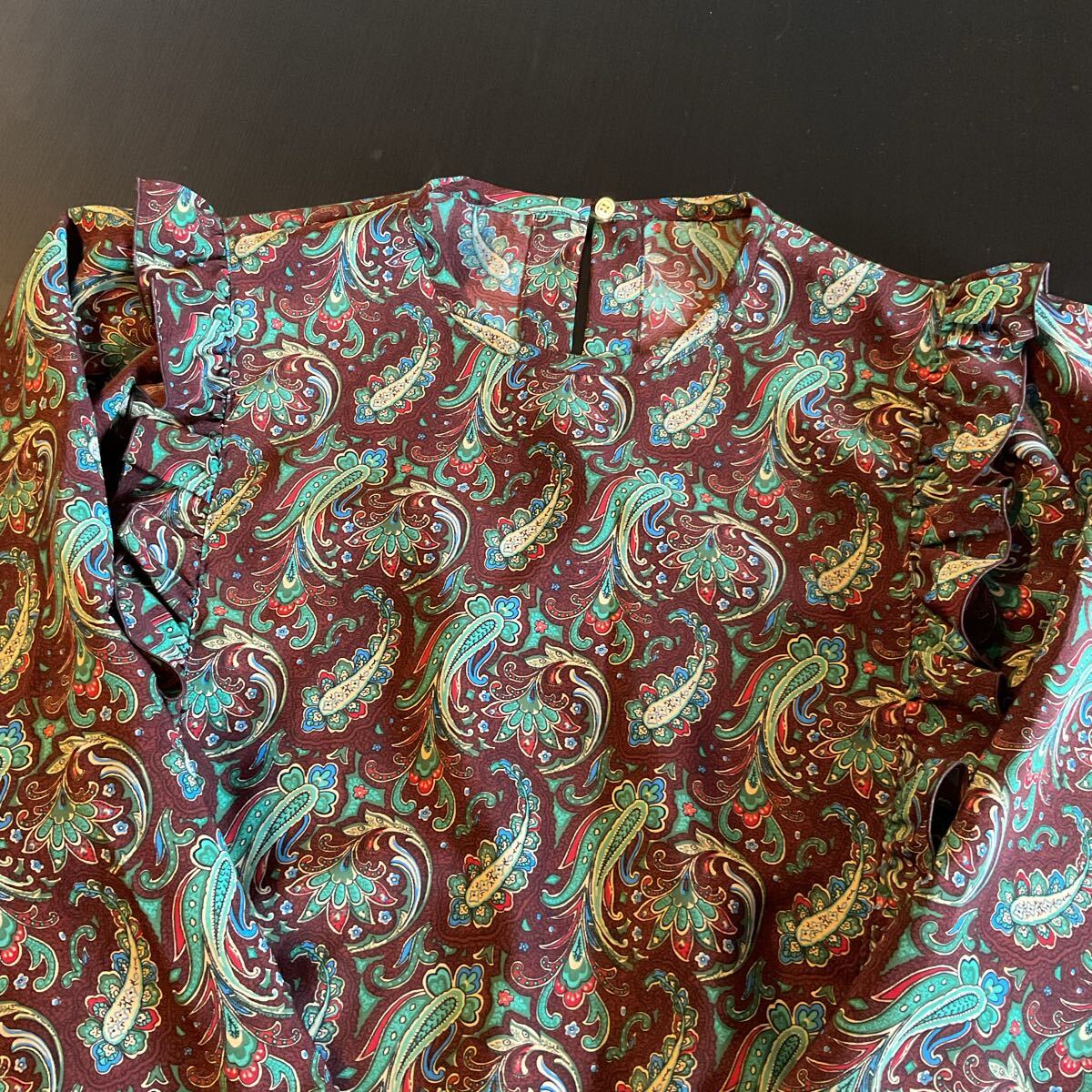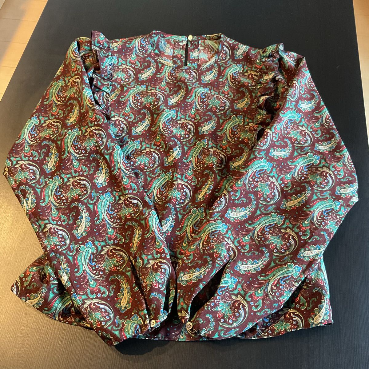 マカフィー フリル付きの茶色と青のペイズリー柄長袖シャツ。
