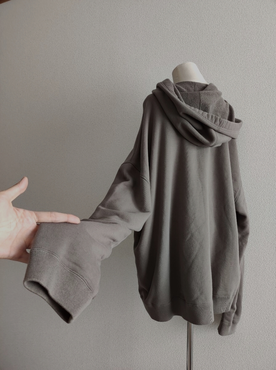 襟ぐりに挟み込んだ仕様のフードがついており、袖はあえて長くしており、袖の途中にあるホールからも手を出せるような2ウェイの着方ができます。