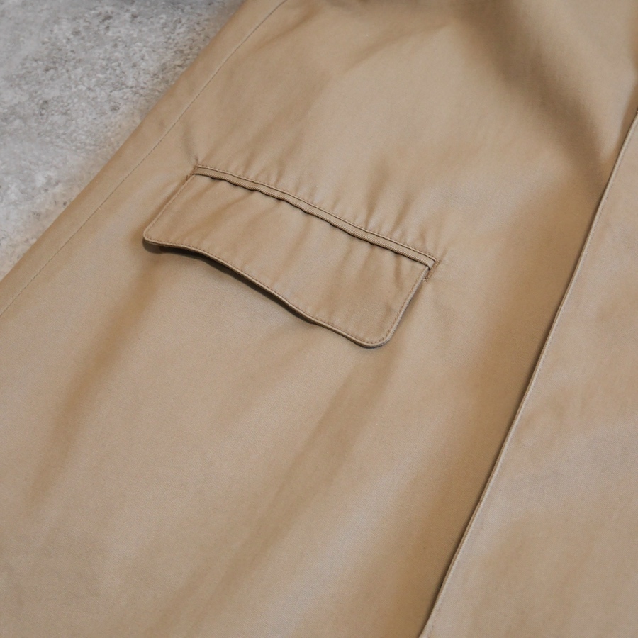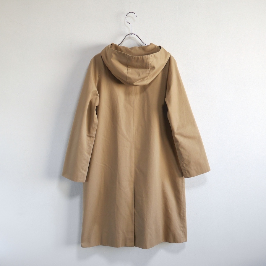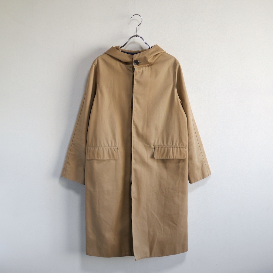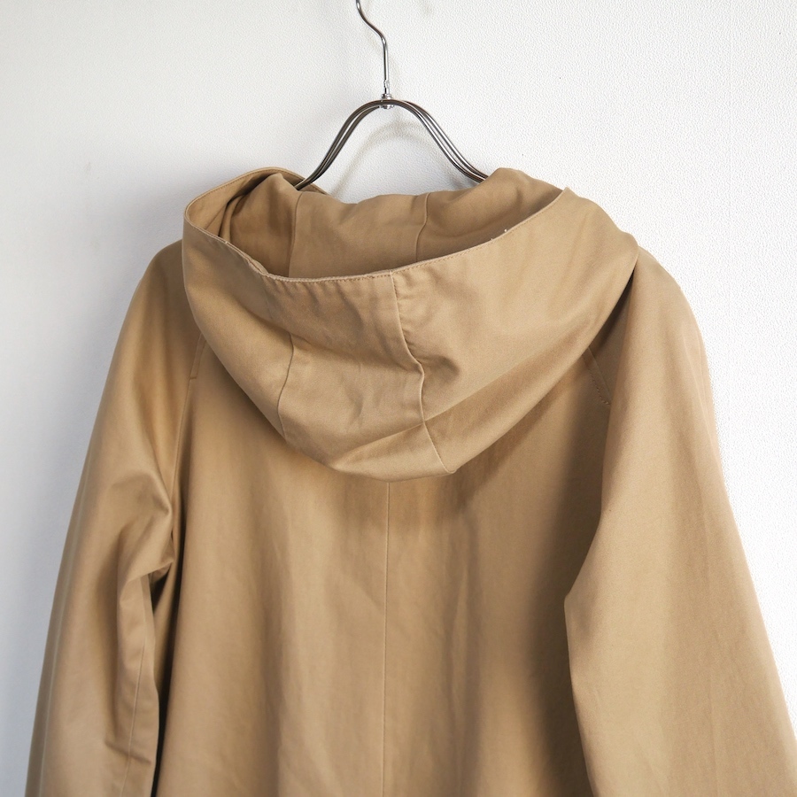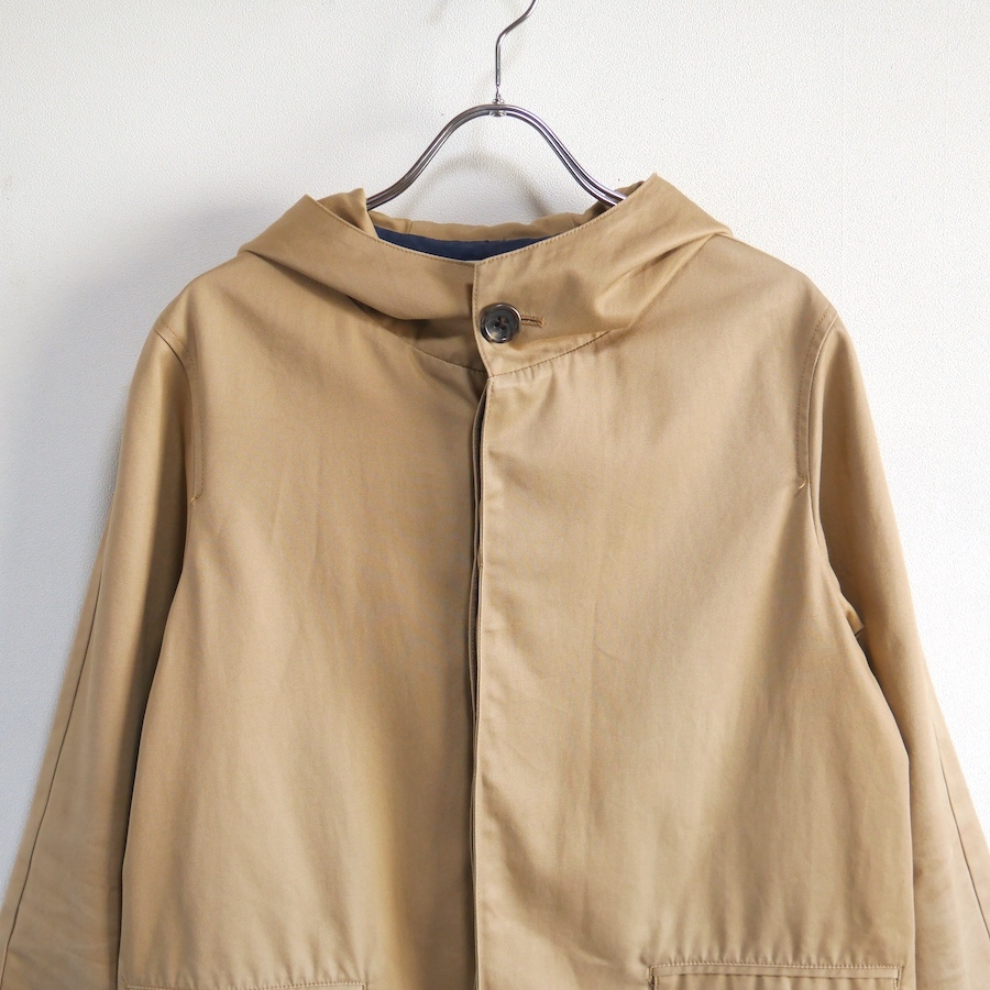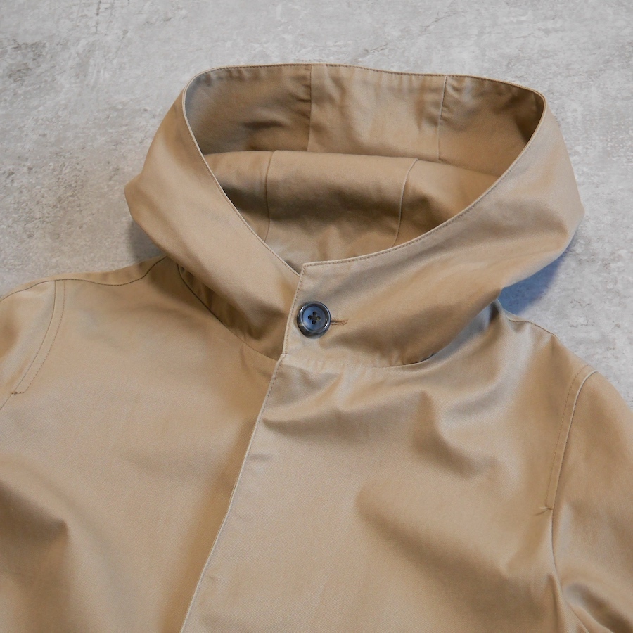 ギャバジン素材を使用した、程よい光沢感としなやかさが魅力のフード付きのコート。 ステンカラーコートのように比翼仕立のシンプルなデザイン。 キチンとした印象とカジュアルさがミックスされたデイリーユースに最適なコートです。 定価27500円です。