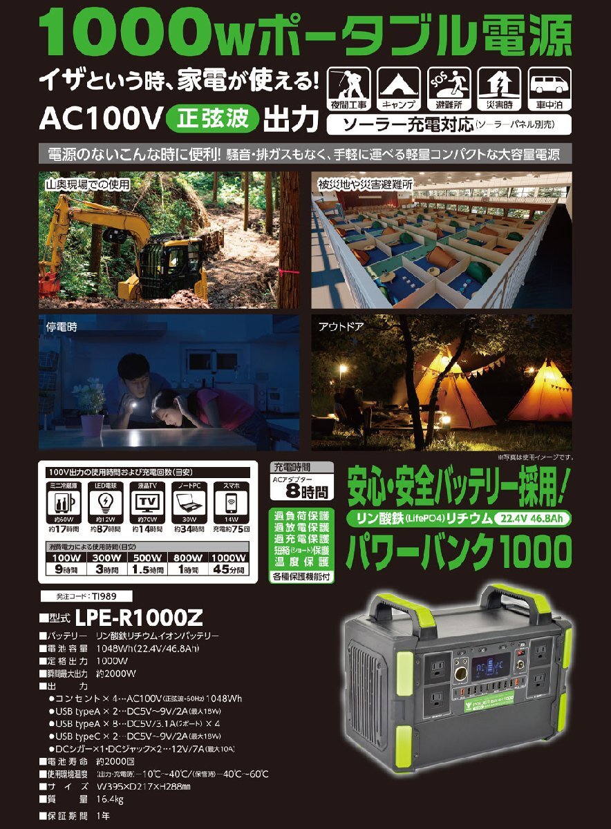 1000W 100V ポータブル電源 パワーバンク1000 LPE-R1000Z 日動工業 山善
