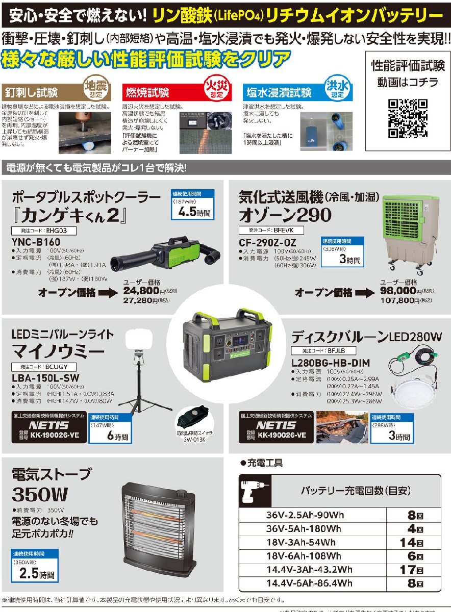 大容量のリン酸鉄リチウムバッテリー採用。1年間保管しても放電しにくいため備蓄用におすすめ。