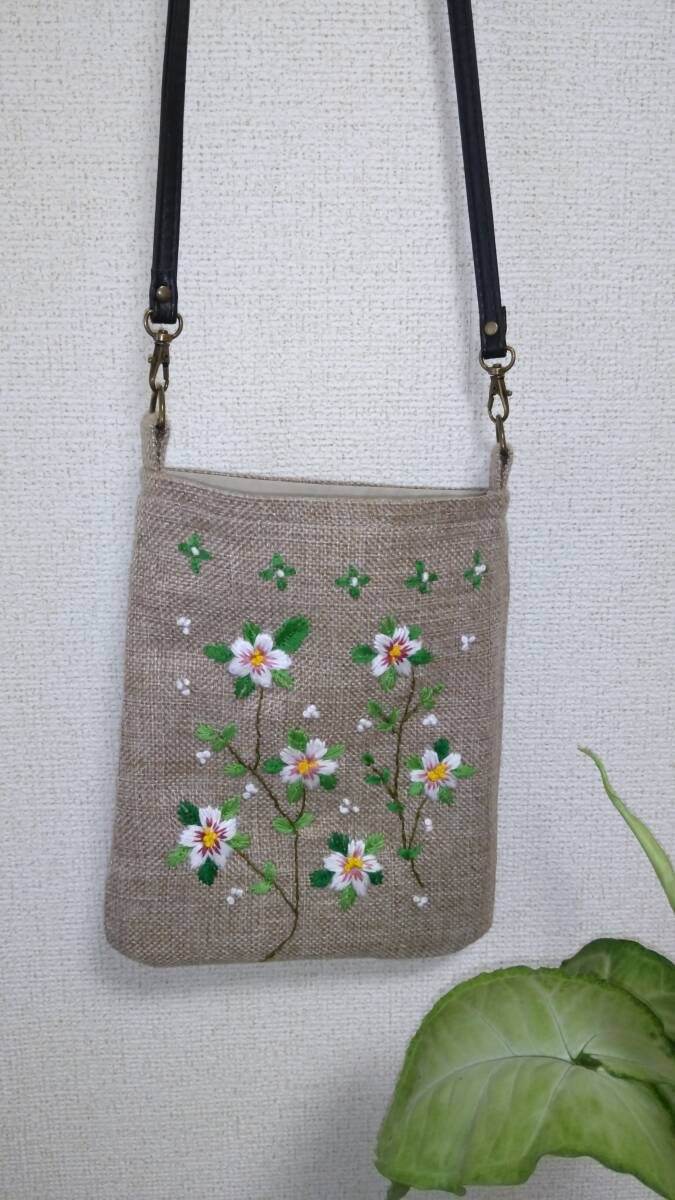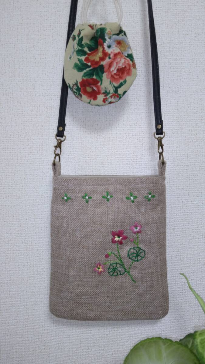 ハンドメイド・オンリーワンのバック・手刺繍・リネン・かわい-いお花・ナスタチュ―ム・巾着も・手刺繍ショルダー/斜め掛けバック