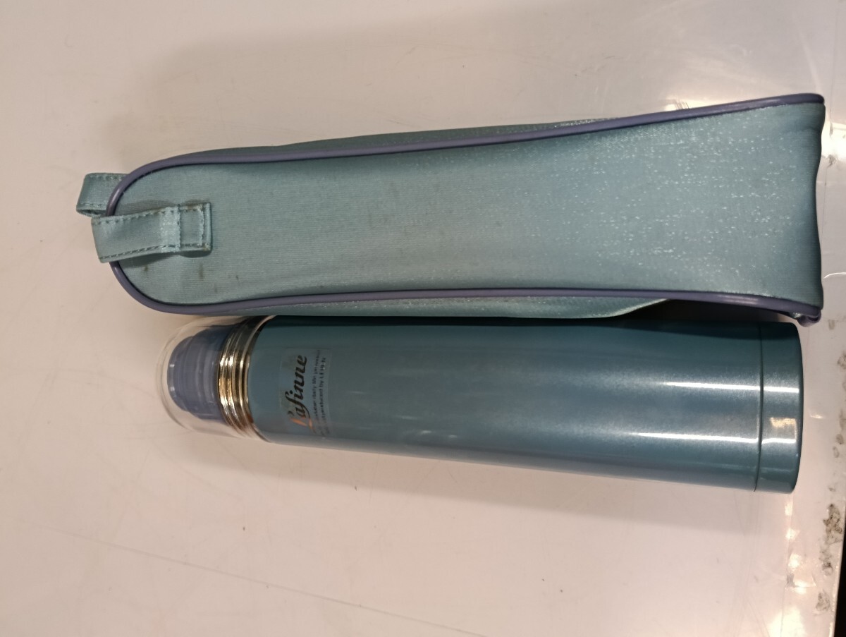 ・外観:中古品です。水色のポーチにはシミや汚れが見られます。シルバーのボトルの底にはマジックでの記名があります。その他、使用に伴うスレや小傷、汚れなどがございます。詳細は画像にてご確認ください。