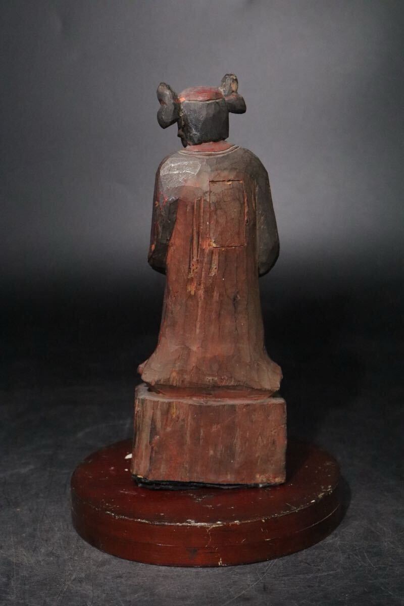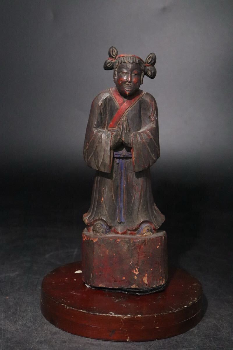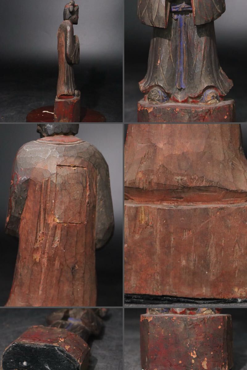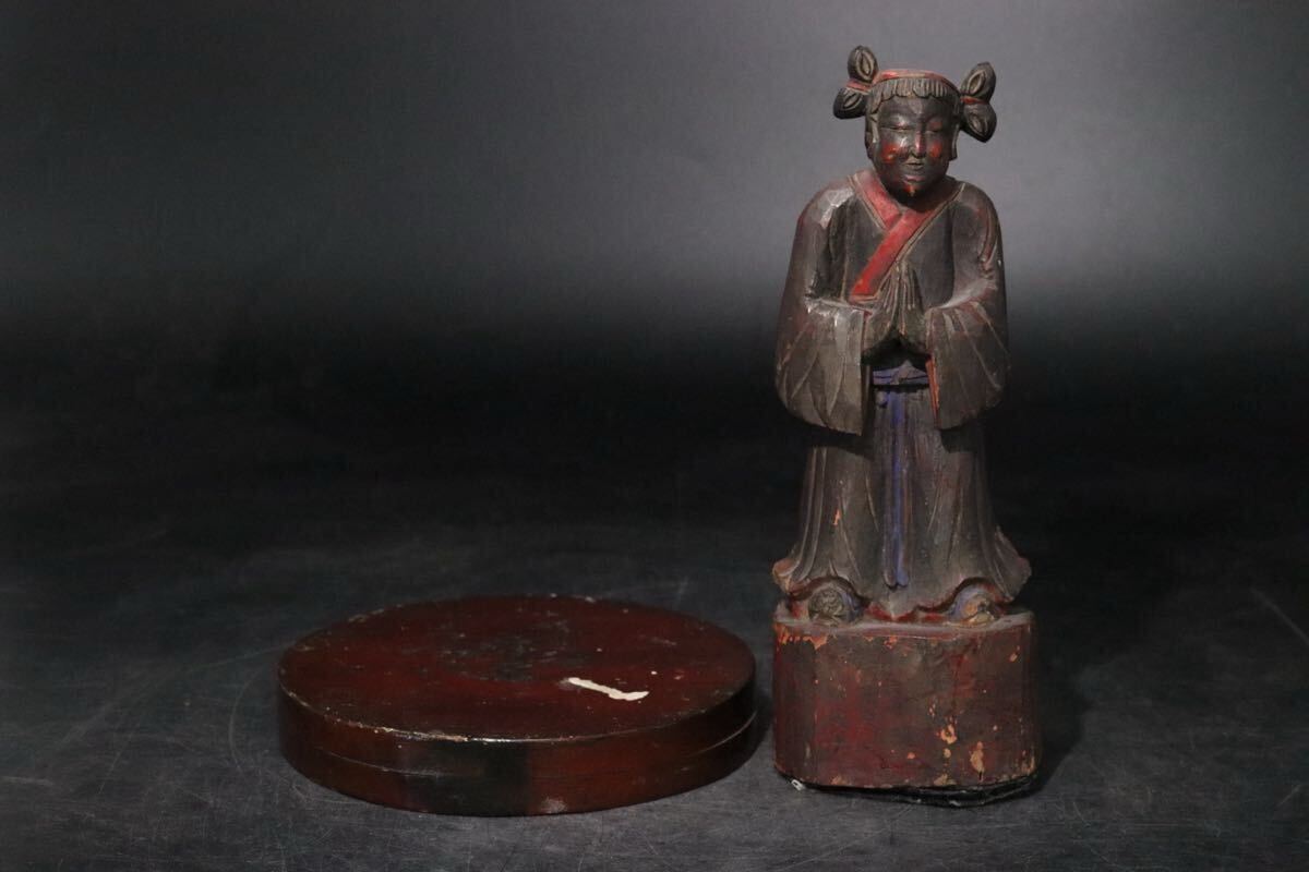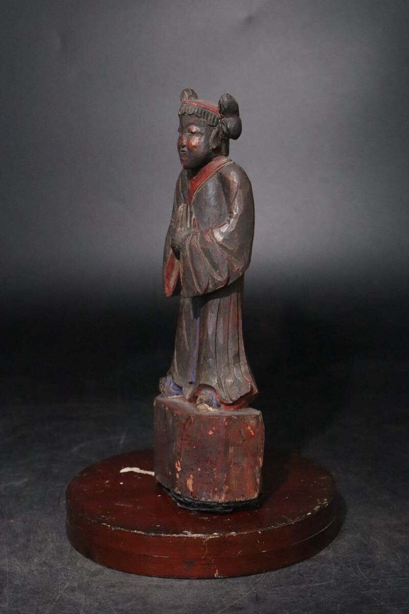 | 時代 木製 彩色 人物 立像 台座付 / 中国美術 木彫 置物 煎茶飾 仏像 .B1286 |