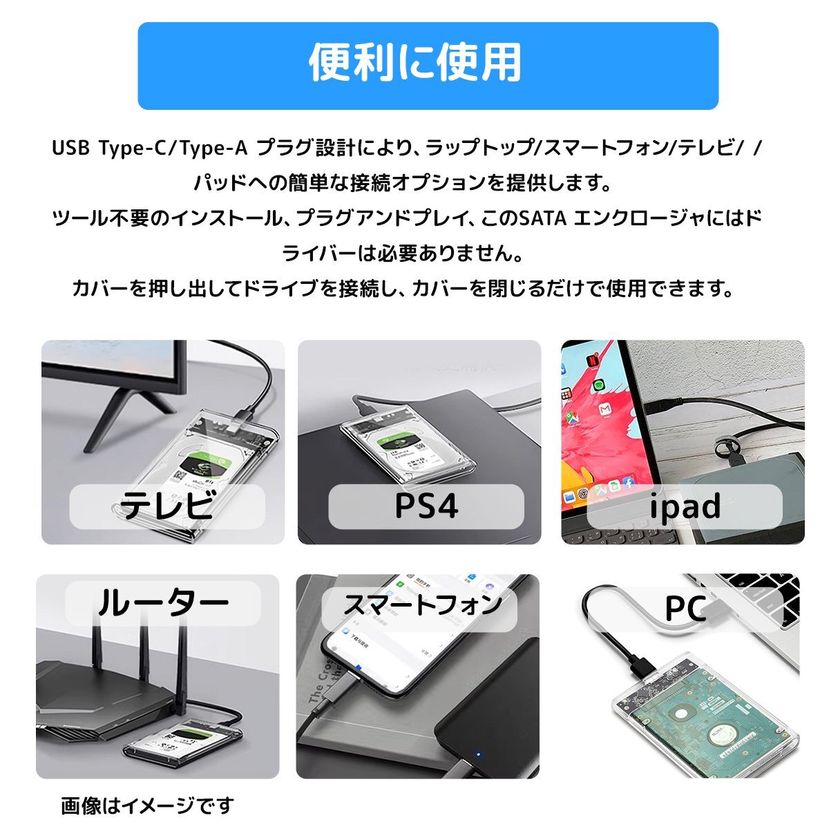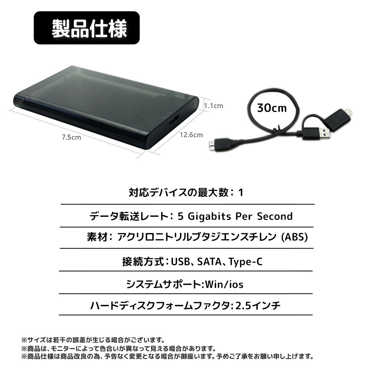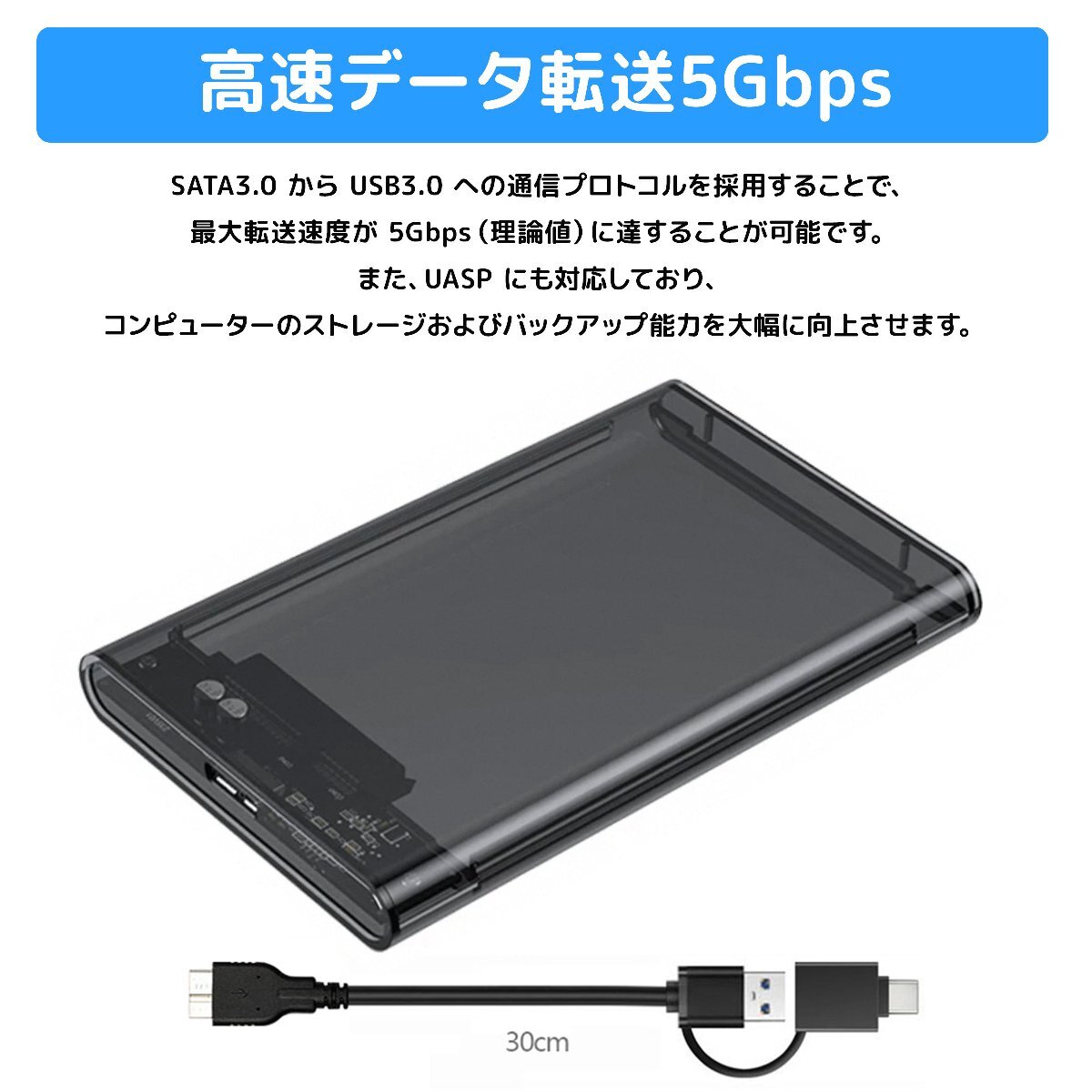 HDD SSD ケース 2.5インチ USBケーブル付き USB3.0 SATA3.0 ハードディスク 5Gbps 高速データ転送 外付けケース スモーク クリックポスト便