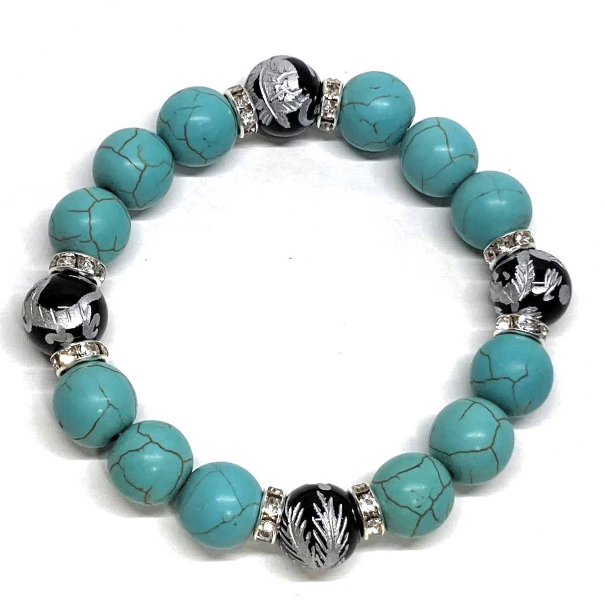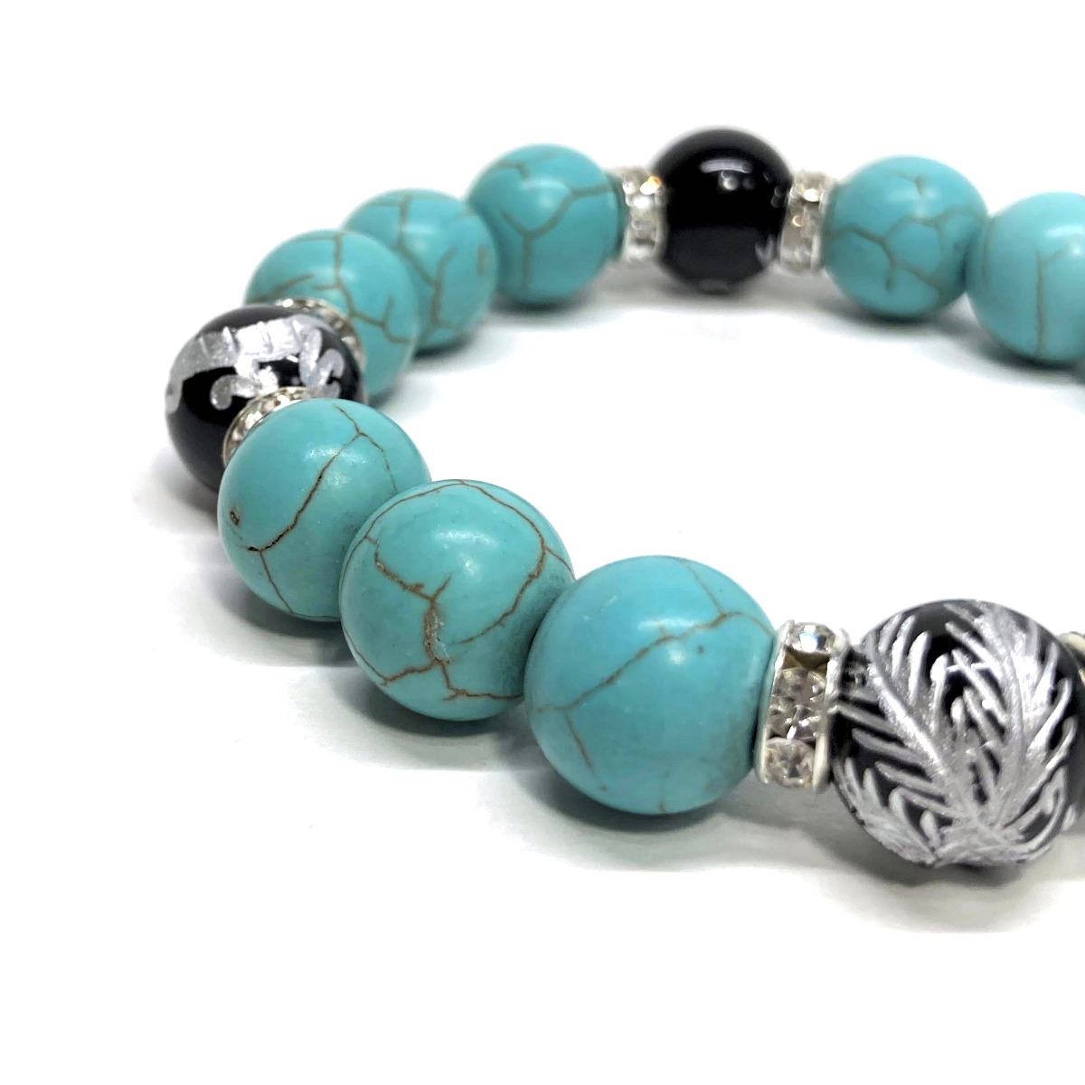 四神獣銀彫オニキス×ターコイズ 12mm パワーストーン ブレスレット青龍 白虎 玄武 朱雀 運気上昇 お守り 金運 健康運 四神獸 四神相応 S2