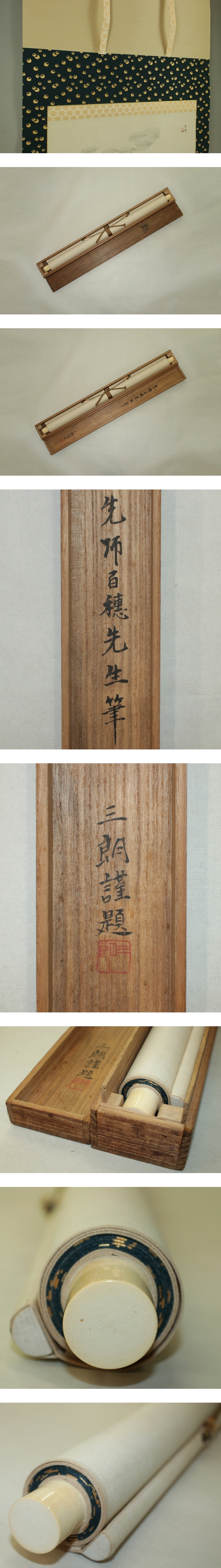 平福百穂 ひらふく-ひゃくすい(1877-1933) 明治-昭和時代前期の日本画家。 明治10年12月28日生まれ。平福穂庵の4男。川端玉章に師事。 明治33年結城素明らと无声会を結成,文展に「アイヌ」などを出品した。 昭和5年帝国美術院会員,7年母校東京美術学校の教授。歌集に「寒竹」。 昭和8年10月30日死去。57歳。秋田県出身。本名は貞蔵。 本紙は、染み、軽い折れがあります。 表装は、染み、軽い汚れ、皺、箱に破損があります。 【サイズ】 作品 横約51cm×縦約36cm 表装 横約64cm×縦約133.5cm |