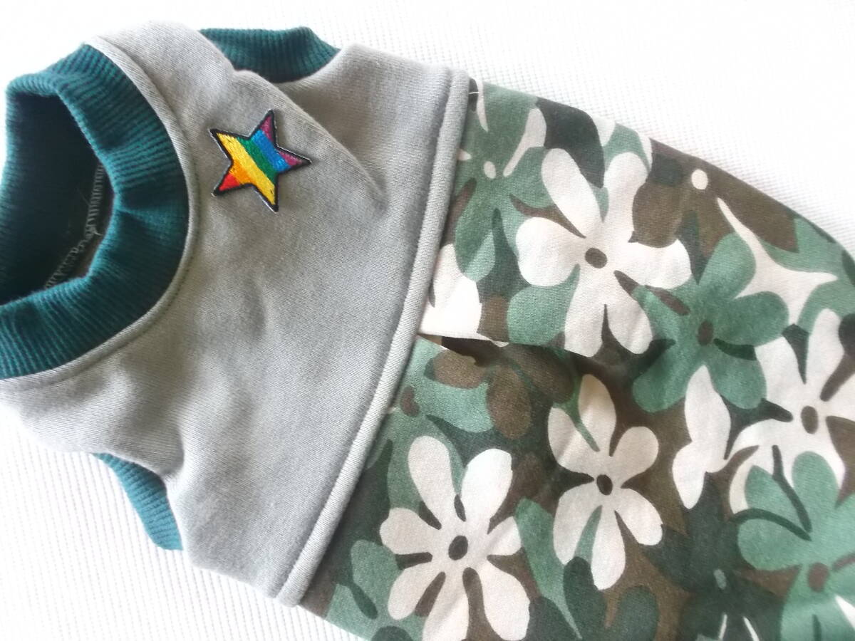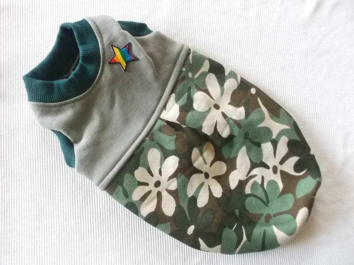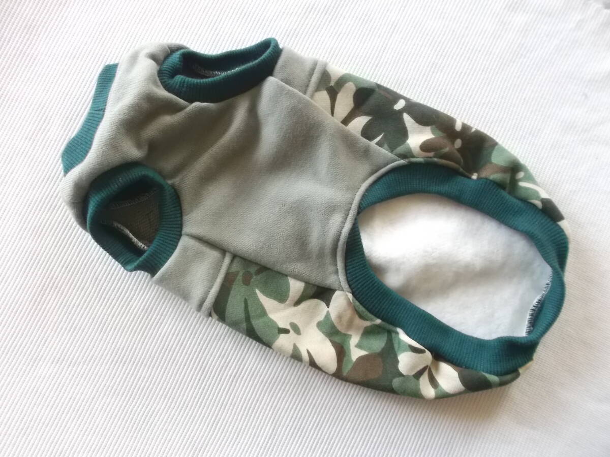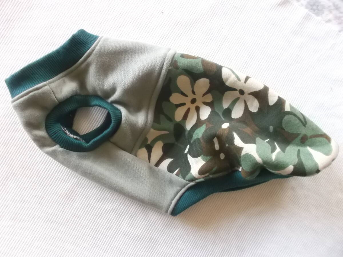 モスグリーンの裏毛ニットと裏起毛ニットの花柄を切り替えて