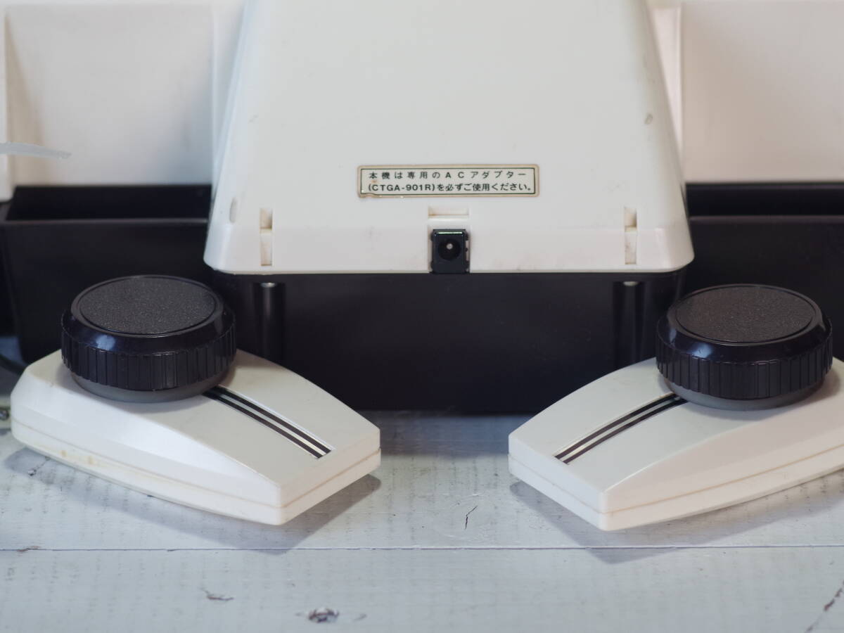 こちらは1978年、ファミコン以前に先駆けて任天堂のテレビゲーム「RACING112」です。外箱と純正アダプターが付属します。テレビに繋いで動作確認したところゲーム遊べました。ハンドルを操作して車を避け続けるゲーム2Pも可能です。コンデンサが劣化しているのがケーブルの接触が悪いのか、映像はノイズが乗ります。音声は確認できませんでした。遊んでるうちに出るのかもしれません。コントローラーやボタン、スイッチは正常に動作しました。現状です。古いゲーム機は保管中や発送時のショックで動作不良を起こすことがあります。メンテナンスの必要が発生した場合は、お客様自身でお願い致します。