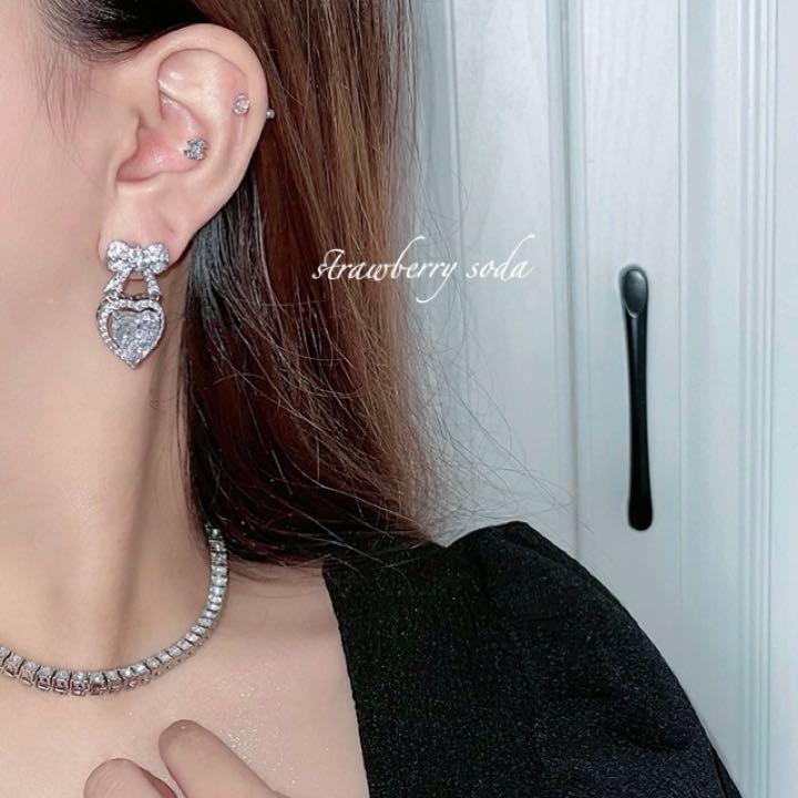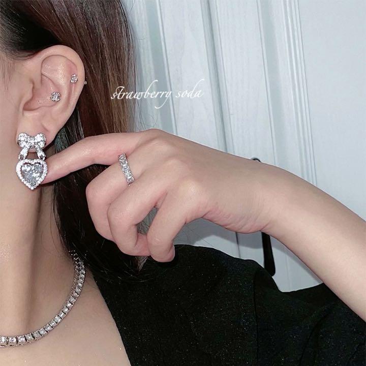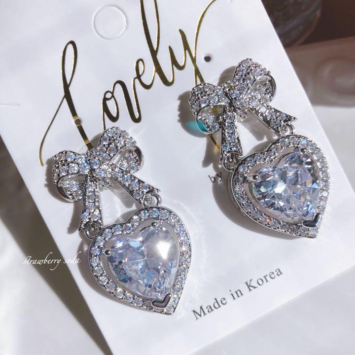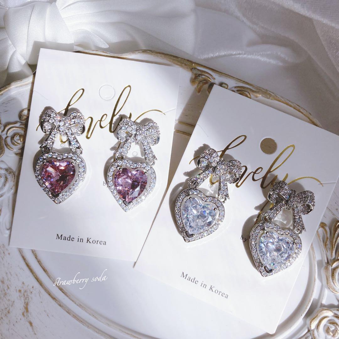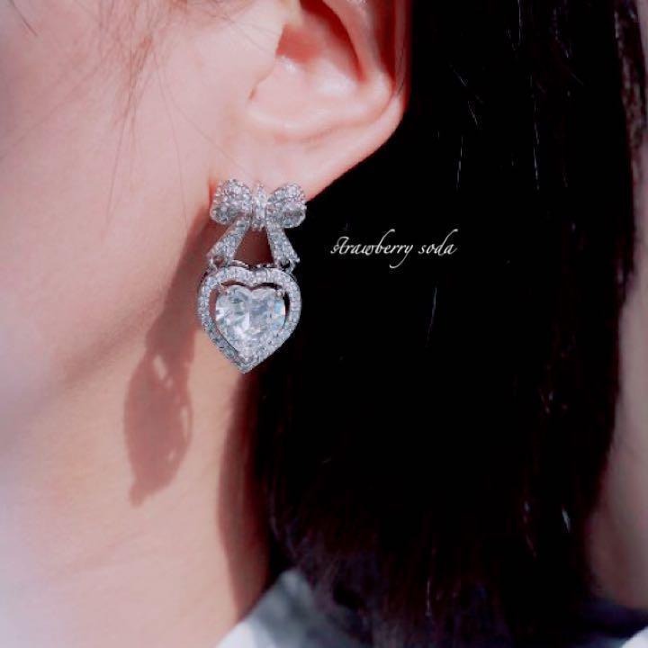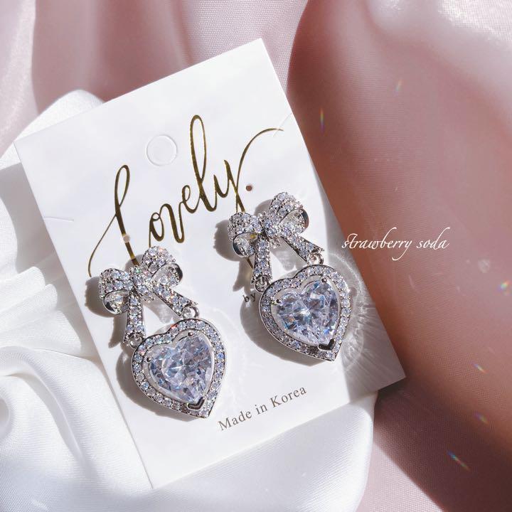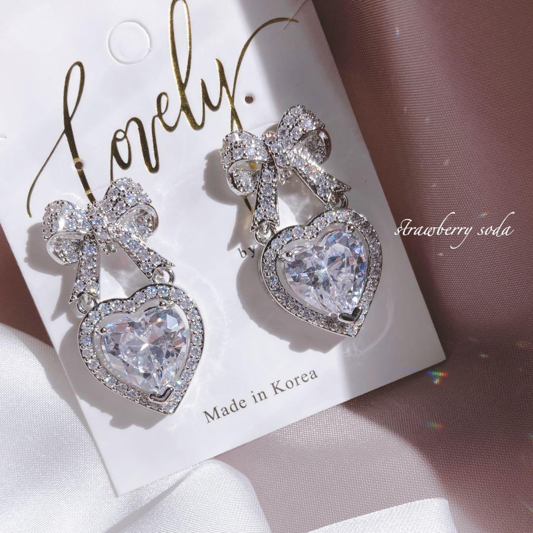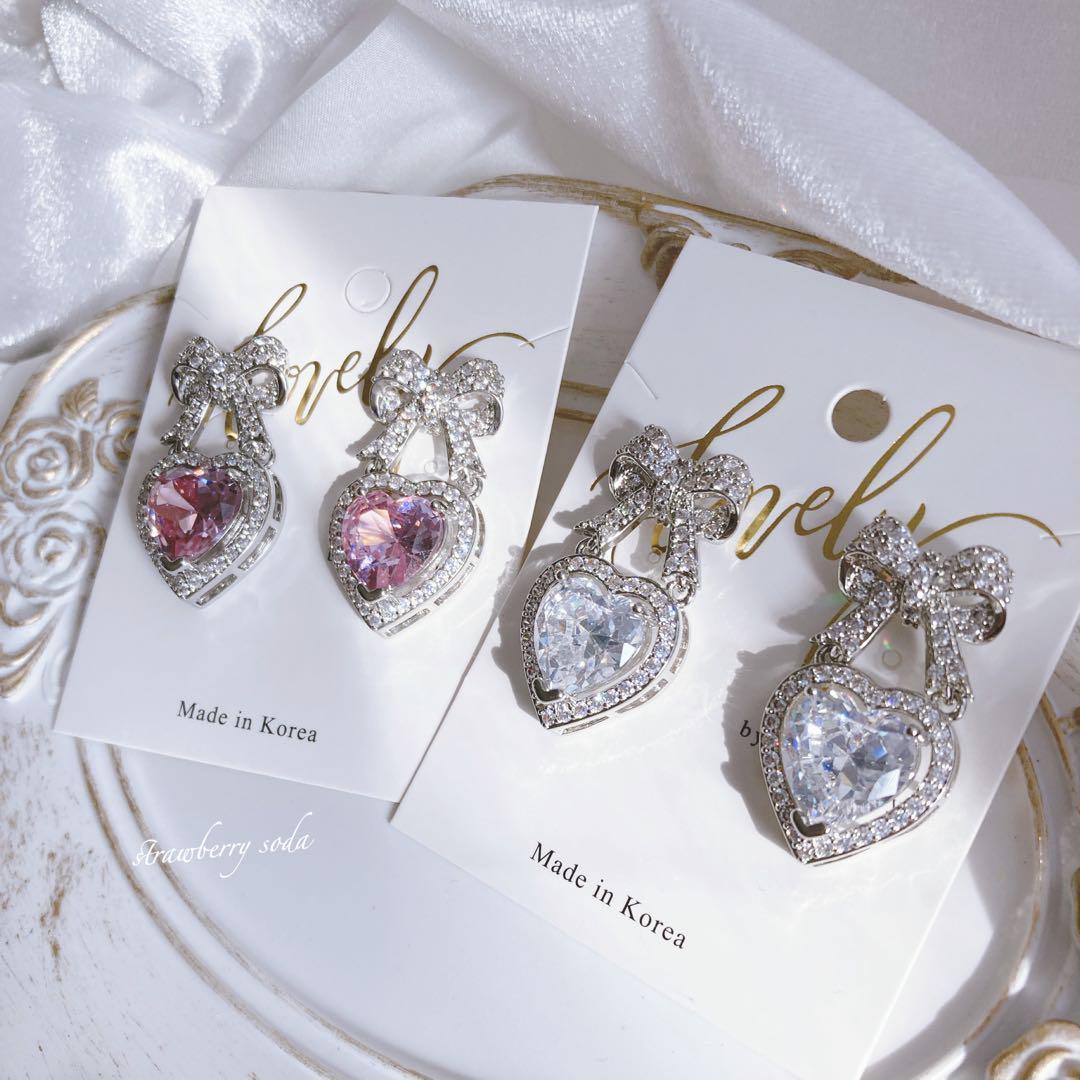 ハート型にカットされた高級感溢れるジルコニアとキラキラリボンの組み合わせがロマンティックなデザインです *