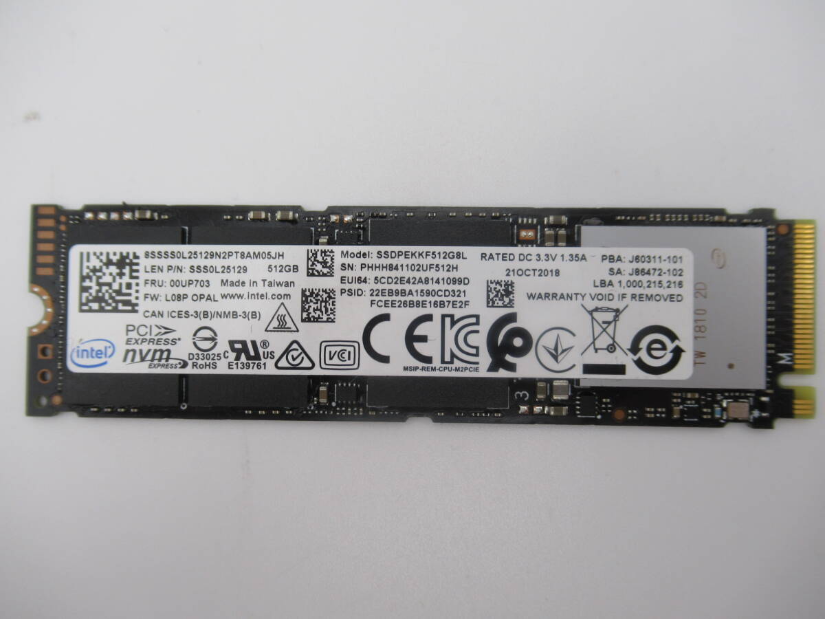| ★商品説明★ | INTEL SSD M.2 2280 NVMe 512GB 1枚 中古 動作確認済みです。 写真は現物です。写真にもご確認の上ご入札下さい。 中古品ですので使用感が御座います。動作確認済みですが、相性は保証いたしません。 適用機種はよくご確認した上で、ご入札くださいませ。 |