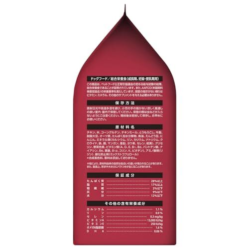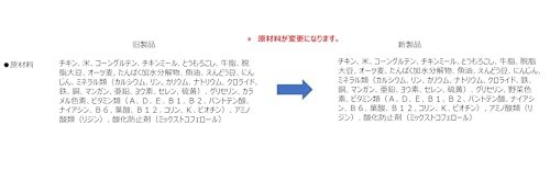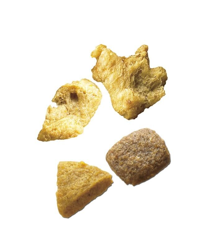 ・原材料:チキン、米、コーングルテン、チキンミール、とうもろこし、牛脂、脱脂大豆、オーツ麦、たんぱく加水分解物、魚油、えんどう豆、にんじん、ミネラル類(カルシウム、リン、カリウム、ナトリウム、クロライド、鉄、銅、マンガン、亜鉛、ヨウ素、セレン、硫黄)、グリセリン、野菜色素、ビタミン類(A、D、E、B1、B2、パントテン酸、ナイアシン、B6、葉酸、B12、コリン、K、ビオチン)、アミノ酸類(リジン)、酸化防止剤(ミックストコフェロール)