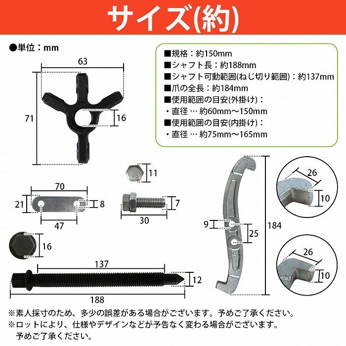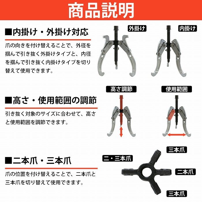 【新品即納】手動 ギアプーラー 3本爪 2本爪 兼用 外径 60~150mm 対応 6インチ ギア プーリー 抜き 外し 外掛け 内掛け 150mm 工具