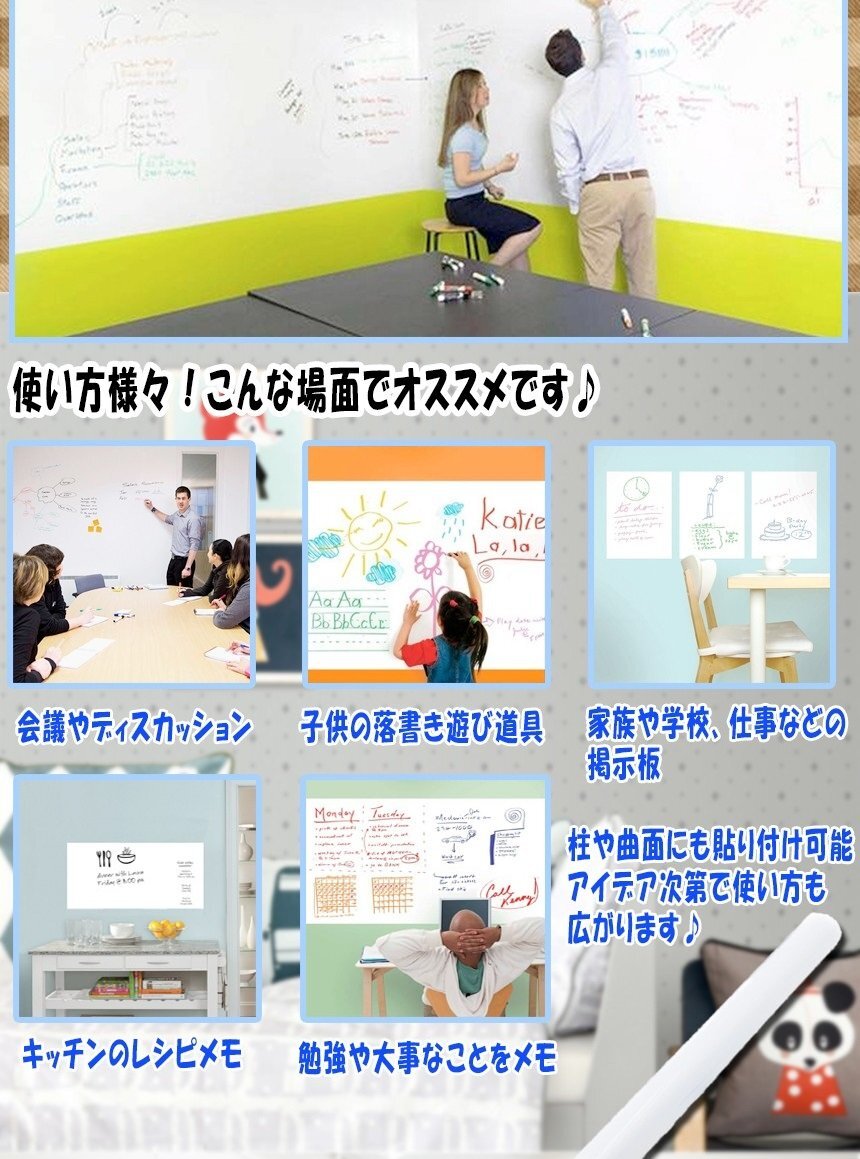 貼り付け簡単♪剥がすのも簡単♪ 好きなサイズに自由にカット! 複数張り合わせて巨大なホワイトボードも可能! 使い方様々! 注意事項 ※輸入品の為仕様等は予告なく変更される場合があります。 |