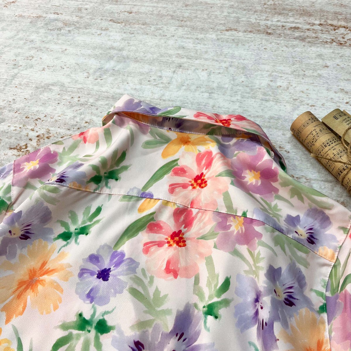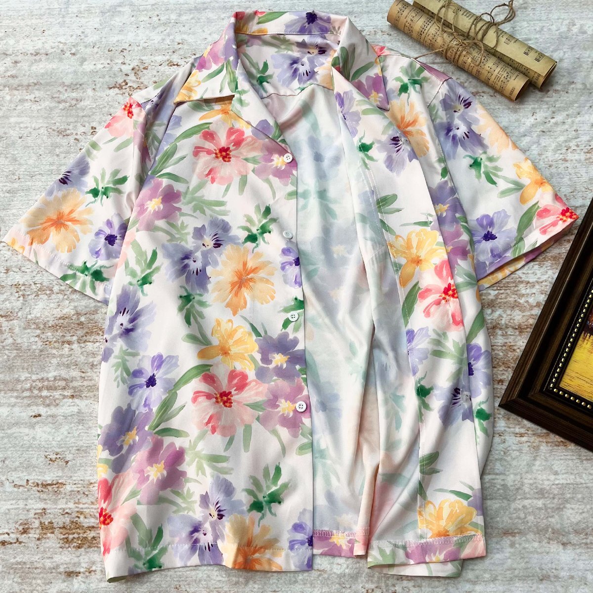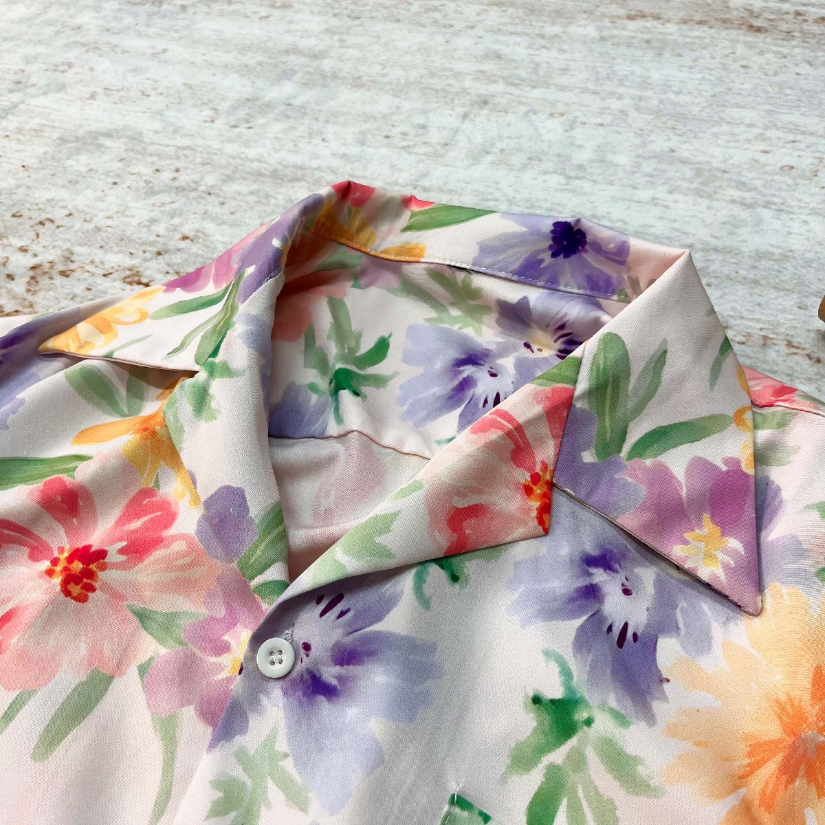 半袖シャツ ロンドン製造 コットン混/シルク混 薄手 柔らか 涼しげ 花柄 カラフル 開襟シャツ アロハシャツ リゾート ビーチ 海 夏 SIZE:L