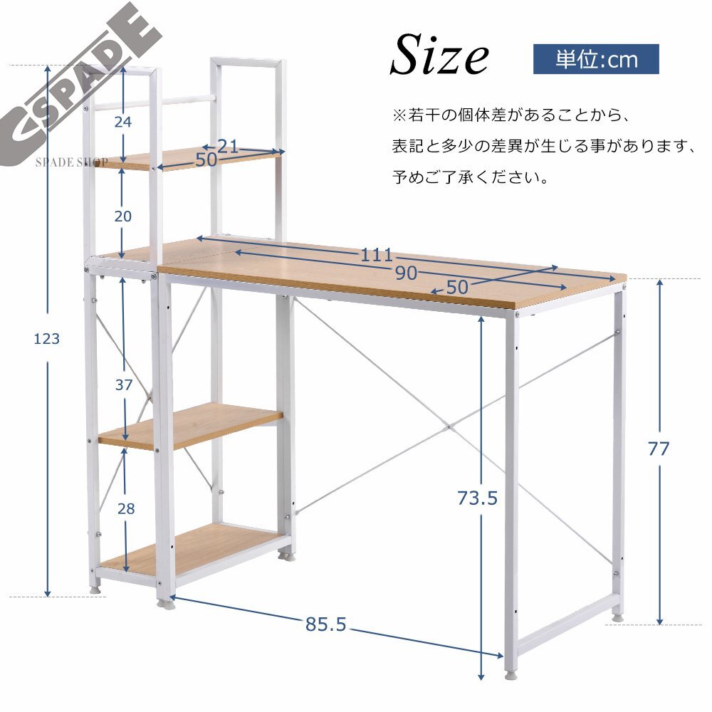 • 3.【大収納力備える4段目ラック付き】ほしいものにすぐ手が届く多段ラックが付いています。シェルフの棚板は耐荷重15kgの頑丈設計で、本やDVD・CDなどをたっぷり収納できます。4.【一体分割り使用可能のデスクとラックデザイン】サイドラックはデスクに付けられるだけではなく、単品でもお使い頂けます。広大なワークスペースの使い方法はパソコンデスクだけでなく、ミシン台や工作台等様々な用途で使用できます。