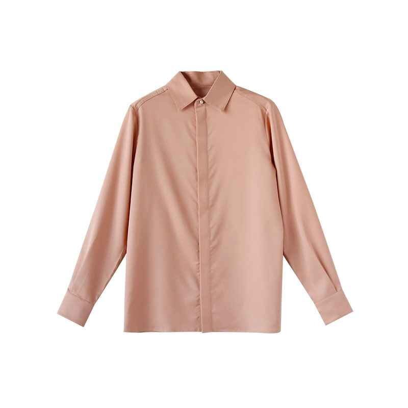 全体的にシンプルなデザイン、サラサラした肌触り、シャツの一番上のボタンにパールが付いているのがポイントです。