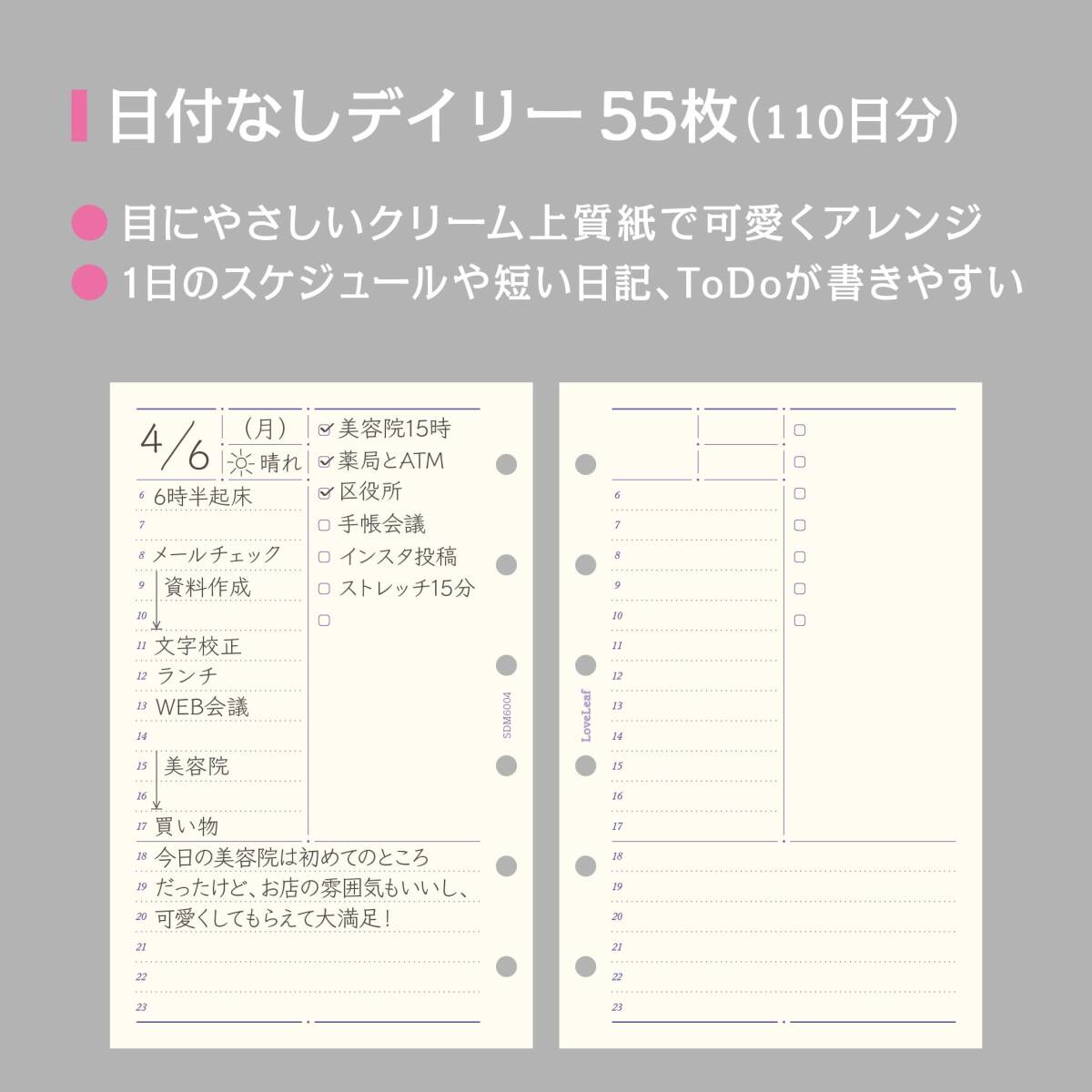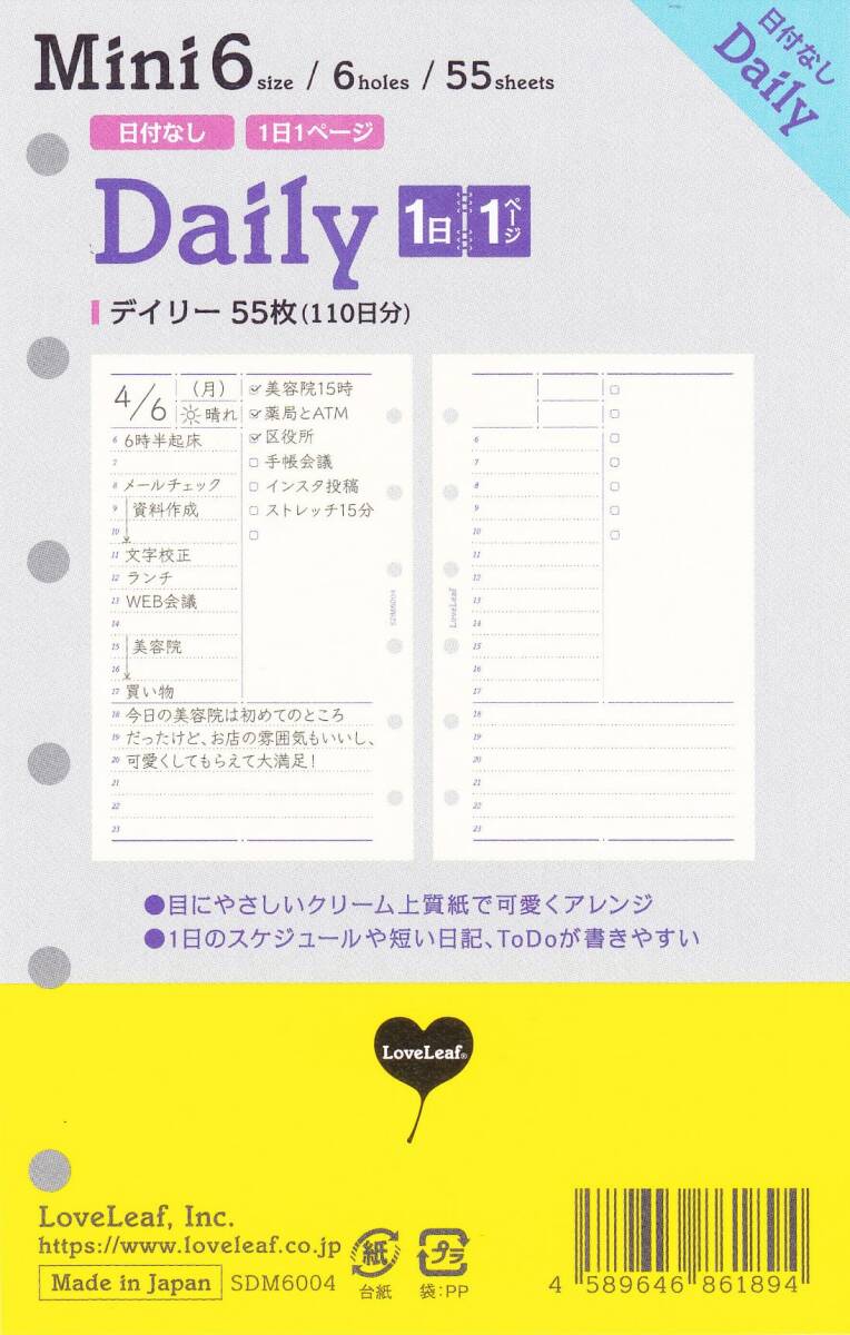 ラブリーフ システム手帳 リフィル ミニ6 デイリー 日付なし 見開き2日 55枚 6穴 SDM6004