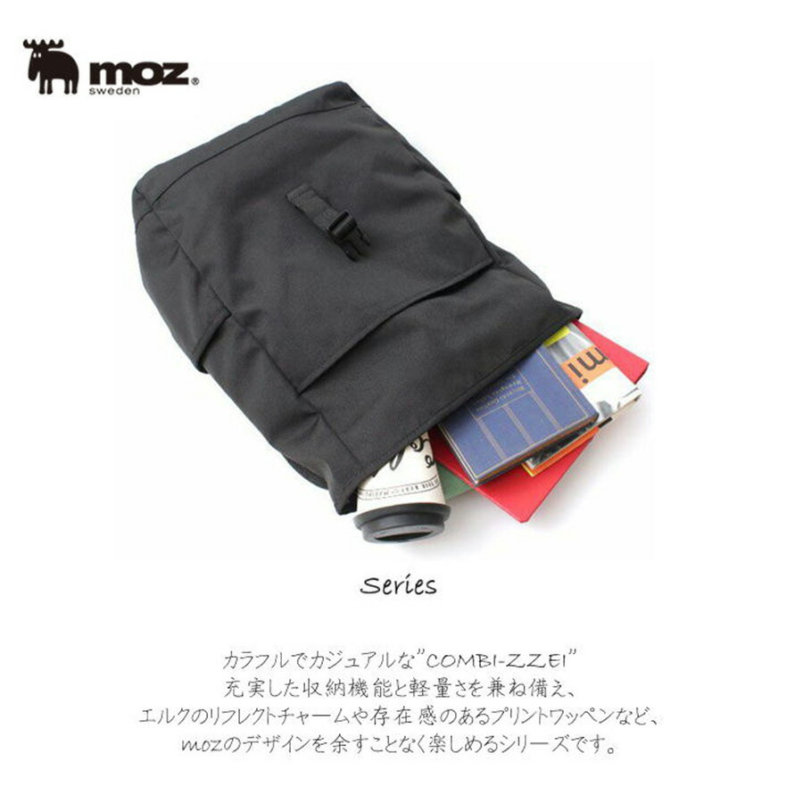 | 商品説明 | 北欧ブランドmoz(モズ)、メランジ素材の切り替えがデザインのアクセントになっている「COMBI - ZZEI」シリーズ。ZZEI-12は、B4サイズが収納可能なかぶせリュックサックです。通学や1泊程度の旅行、マザーズバッグとしても使える大容量サイズ。内側にはホルダー式ポケット“moz pocket(モズポケット)”を備え、タンブラーやペットボトルなど立てて収納したい物の持ち運びも安心です。外側のサイドポケットは500mlペットボトルや折り畳み傘が収納できる便利な設計。ブランドモチーフのエルク(ヘラジカ)をかたどった、かわいいリフレクトチャームが付属します。 |