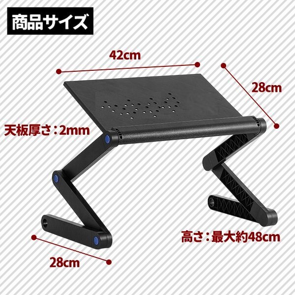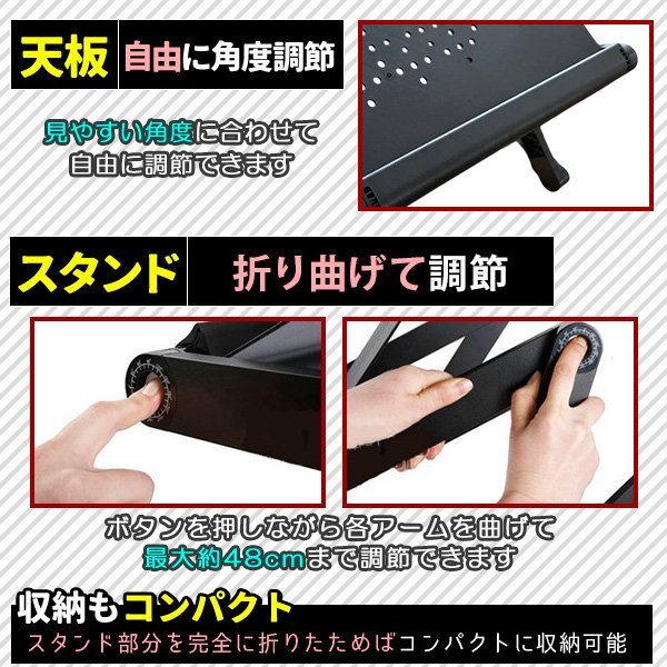 パソコンを載せる天板は自由に角度調節ができ、折り曲げて高さ調節が可能です。
