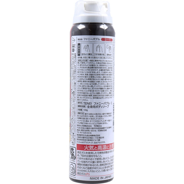 あそんであらえるボディーソープ! しっとり保湿処方★ ・国内生産。 個装サイズ:40X155X40mm 個装重量:約130g 内容量:100g 製造国:日本 【発売元:天栄株式会社】 【化粧品】 全身用ボディソープ 販売名:TENEI ファニーバブル C 【成分】 水、LPG、グリセリン、プロパンジオール、ラウロイルメチル-β-アラニンタウリンTEA、ココイルグルタミン酸Na、ラウリルヒドロキシスルタイン、コカミドメチルMEA、ベタイン、フェノキシエタノール、クエン酸、グアーヒドロキシプロピルトリモニウムクロリド、スクワラン、α-グルカン、PCA-Na、BG、トレハロース、グルコシルセラミド、ポリクオタニウム-51、カンゾウ根エキス、ヒアルロン酸Na、グリチルリチン酸2K、香料、カラメル 【ご使用方法】 (1)缶をよく振る。 (2)フタを開ける。 (3)泡を出す。 使用後、お肌に残った泡はよく洗い流してください。 【使用上の注意】 ・お肌に異常が生じていないかよく注意して使用してください。 ・化粧品がお肌に合わないとき、即ち次のような場合には、使用を中止してください。 そのまま化粧品類の使用を続けますと、症状を悪化させることがありますので、皮膚科専門医等にご相談されることをおすすめします。 (1)使用中、赤味、はれ、かゆみ、刺激、色抜け(白斑等)や黒ずみ等の異常があらわれた場合。 (2)使用したお肌に、直射日光があたって上記のような異常があらわれた場合。 ・傷やはれもの、湿疹等、異常のある部位にお使いにならないでください。 ・目に入らないよう注意してください。 ・目に入ったときは、直ちに洗い流してください。 ・缶を横向きや逆さにして使用すると、ガスのみが噴射され、最後まで使用できないことがありますのでご注意ください。 ・乳幼児の手の届かないところに保管してください。 ・極端に高温又は低温の場所、直射日光の当たる場所には保管しないでください。 ・使用後は必ずしっかりとフタを閉めてください。 ・捨てる時は火気のない屋外で噴射音が消えるまでボタンを押し、ガスを抜いてから、市町村の廃棄方法に従って処分してください。 注意事項 ※予告なく成分・パッケージが変更になることがございます。 予めご了承ください。 *予告なく成分・パッケージが変更になることがございます。予めご了承ください *ダンボールを使用して発送する場合には、入数以下の個数の場合、 中古ダンボールを使用する場合があり、ご注文の商品とは異なるダンボールになる場合があります。 あらかじめ、ご了承ください。 |