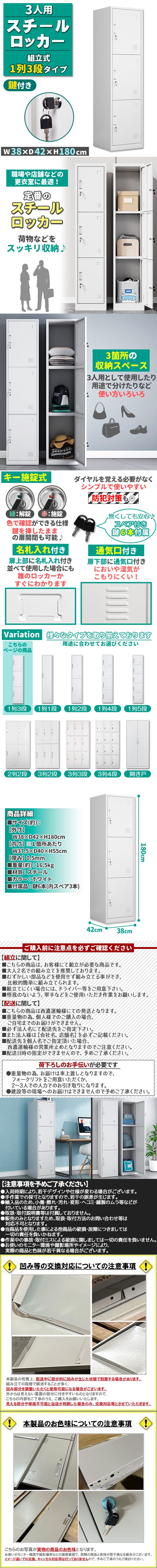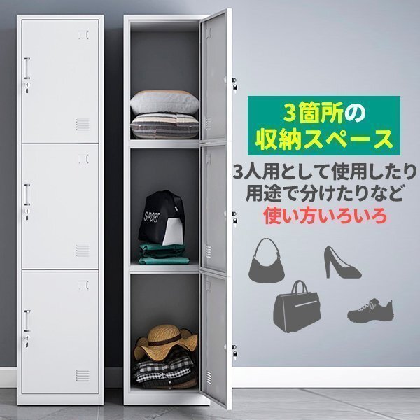 ロッカー スチールロッカー 3人用 ホワイト 白 鍵付き スペアキー付き 1列3段 スチール製 収納 オフィス 事務所 会社 店舗 学校 業務