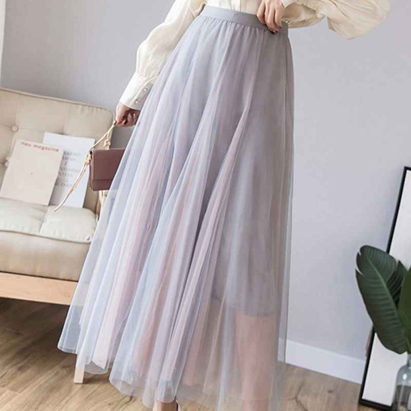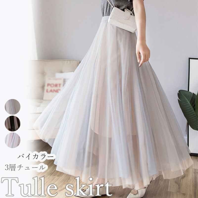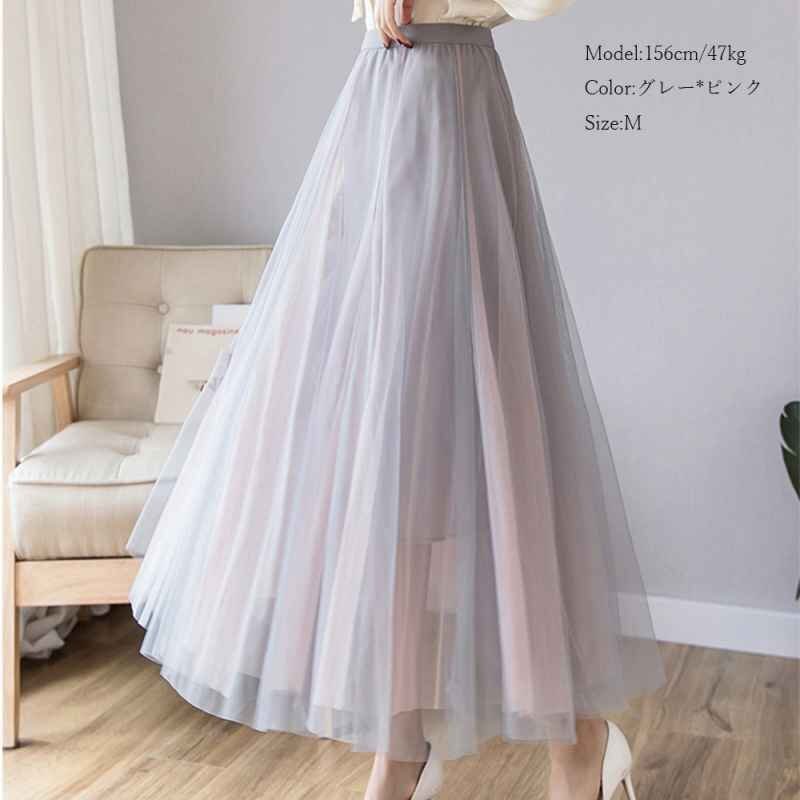 内外バイカラーで重なりを楽しめるデザインのチュールロングスカート