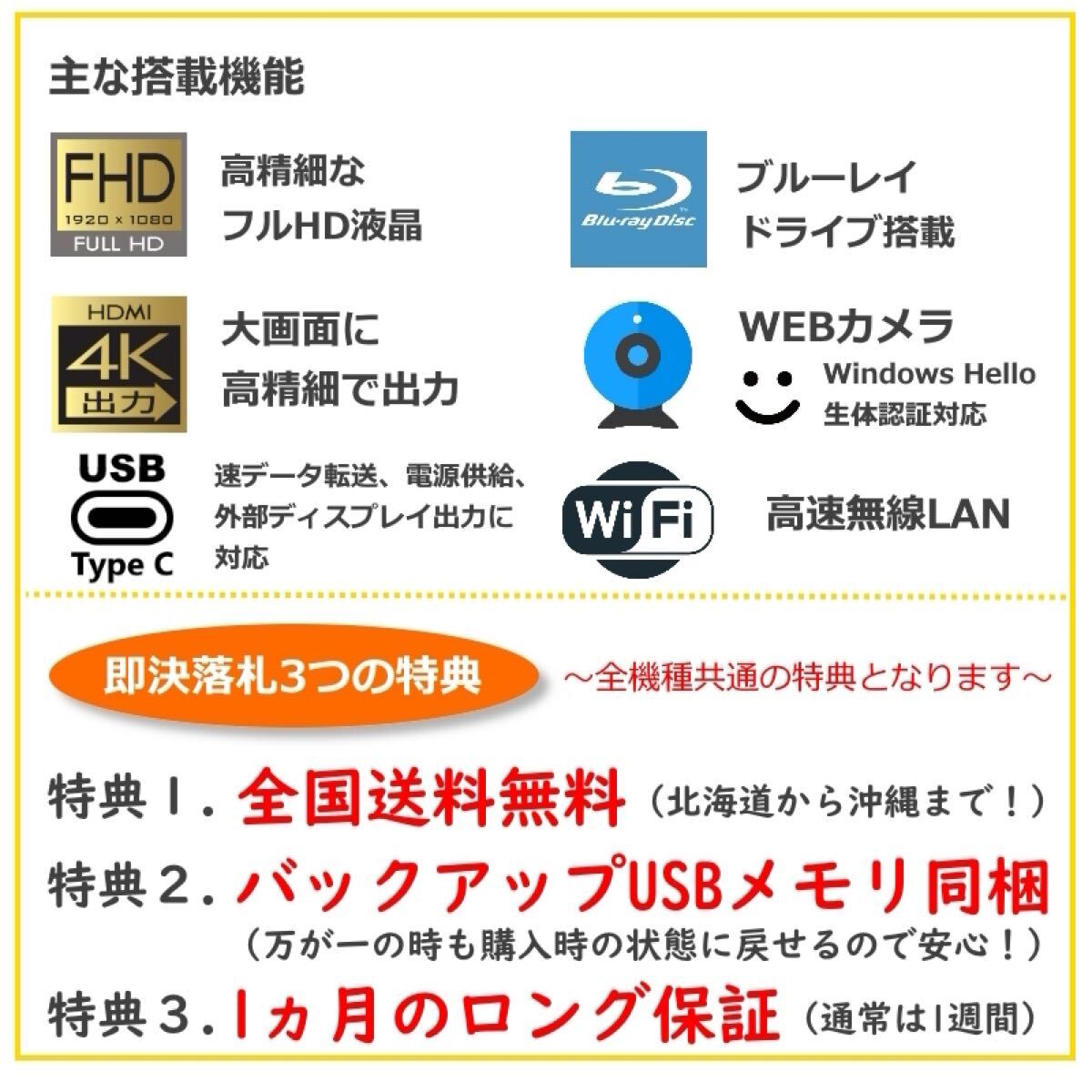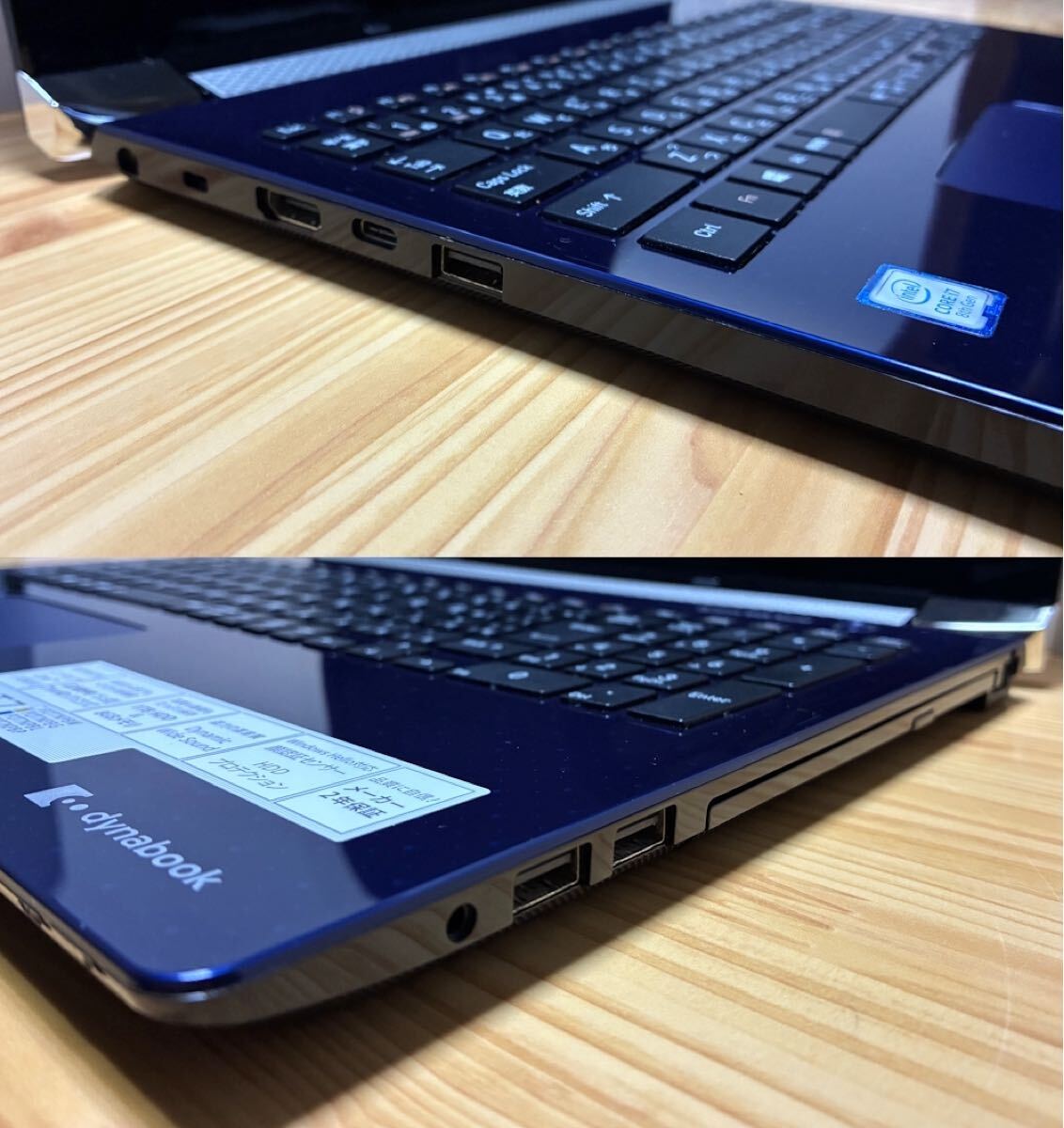 美しいスタイリッシュブルーとスマートなデザインがお洒落で高級感があります! 【ココ重要】⇒ バッテリーも正常で、状態も大変良好!!しかも美品で大推薦です。 当機種の特徴・オススメPOINT 最新のWindows11でセットアップ済み!(Windows11アップデート要件を満たしたモデルなので安心です。) 搭載CPUの第8世代Core i7-8565Uは大幅に処理性能が向上!! その性能は第7世代の上位CPU Core i7をはるかに凌駕します(なんと1.6倍相当で格段に速いです。) メモリも高性能DDR4仕様で最大値の大容量16GB搭載! ストレージは爆速化に必須の超高速NVMe SSD512GB新品を搭載! ◇即決価格で落札いただいた場合、さらに大容量1TB HDD(良品)を追加してデュアルストレージ仕様にてお届け!◇ 合計1.5TBになるので、容量不足の心配は皆無です。容量を気にすることなく動画も保存し放題! 飛躍的に進化した第8世代上位CPU Core i7+DDR4大容量メモリ+高速高性能NVMe SSD=最強スペック!! クアッドコアでレスポンスも速くあらゆる作業をストレス無く快適に処理してくれる至れり尽くせりの1台です。 ◆液晶はフルHD広視野角Super ClearView IPS液晶で明るく鮮明! ◆音響には名門ブランド ONKYO+DTSによる2way 4speakersを搭載! ◆ドライブはブルーレイドライブなので、ブルーレイの美しい映像と臨場感・迫力・明瞭度に優れたサウンドが楽しめます! ◆インターフェースも4K出力可能なHDMIポート、USB3.0、さらにUSB-Cを搭載! ◆Wi-Fiは11ac準拠、BluetoothはVer5.0準拠でワイヤレス環境も十分です。 ◆当機種は顔認証センサーも搭載しているので、登録すればパスワードを使用せずに手軽かつ高セキュリティでログイン可能! ◆今や必須のWEBカメラも当然内蔵!ZoomやSkypeなどでオンライン会議やミーティングに大活躍! 使うか使わないか分からない不要なソフトを省くことで、PCが遅くなったりするパフォーマンスの低下を防ぎ高速化を維持。 またストレージの容量も無駄に消費することもありません。必要なソフトのみ厳選してインストールしております! (もちろん落札者様で不要なソフトはアンインストール可能です。) ・東芝純正ソフト(dynabookサービスステーション、東芝ヘルスモニタ) PCのCPUやファン、メモリ、SSDの状態が一目で確認でき、さらに診断ツールで 異常がないかもチェックできるので安心です。 ・マイクロソフトオフィス Online、Libreオフィス オンライン環境であれば、いつでも最新のWord、Excel、PowerPointなどフルでお使いいただけます。 オフラインでも、マイクロソフトオフィスと高い互換性があり使い勝手も良いことから企業や官公庁でも導入されている優れもの Libreオフィスで作業ができます。 ・Leawo Blu-ray Player Blu-ray/DVD/ISO/4K動画/HD動画が再生可能メディアプレーヤーソフト! ・Cyberlink Power2Go 使いやすく人気の書き込みソフト。 ・Windows Defender マイクロソフト純正の高性能セキュリティソフトが常時監視しているので安心。 ・Unchecky ダウンロード時に不要なソフトや迷惑ソフトをダウンロードしないように防止してくれるお守り的ソフト。 ・CCleaner パソコンの不要ファイルやレジストリの削除、スタートアップ設定などのメンテナンスを 簡単に行える便利かつ定番ソフト。 その他、ブラウザソフトのGoogle Chrome、メーラーのThunderbird、PDFソフトのAdobe Reader、 Musicソフトの定番iTunesなどもしっかりインストール済みです。 大容量メモリ、超高速高性能NVMe SSD、ブルーレイ、USB-C、4K出力対応HDMIなど充実した装備でテレワークなどのビジネス利用からプライベートでの趣味利用まで幅広い用途に思う存分ご活用できる1台です。 内部までしっかりと清掃・メンテナンスを行っておりますが、万一到着時に初期不良等がありました際は、責任をもって対応させていただきますのでご安心ください。 |