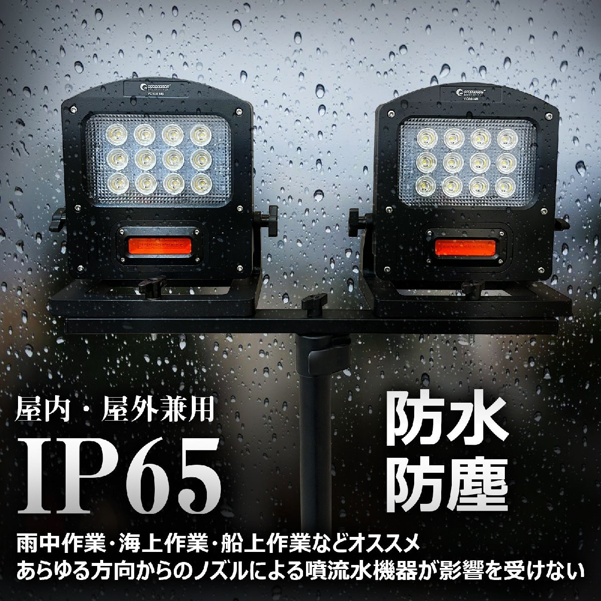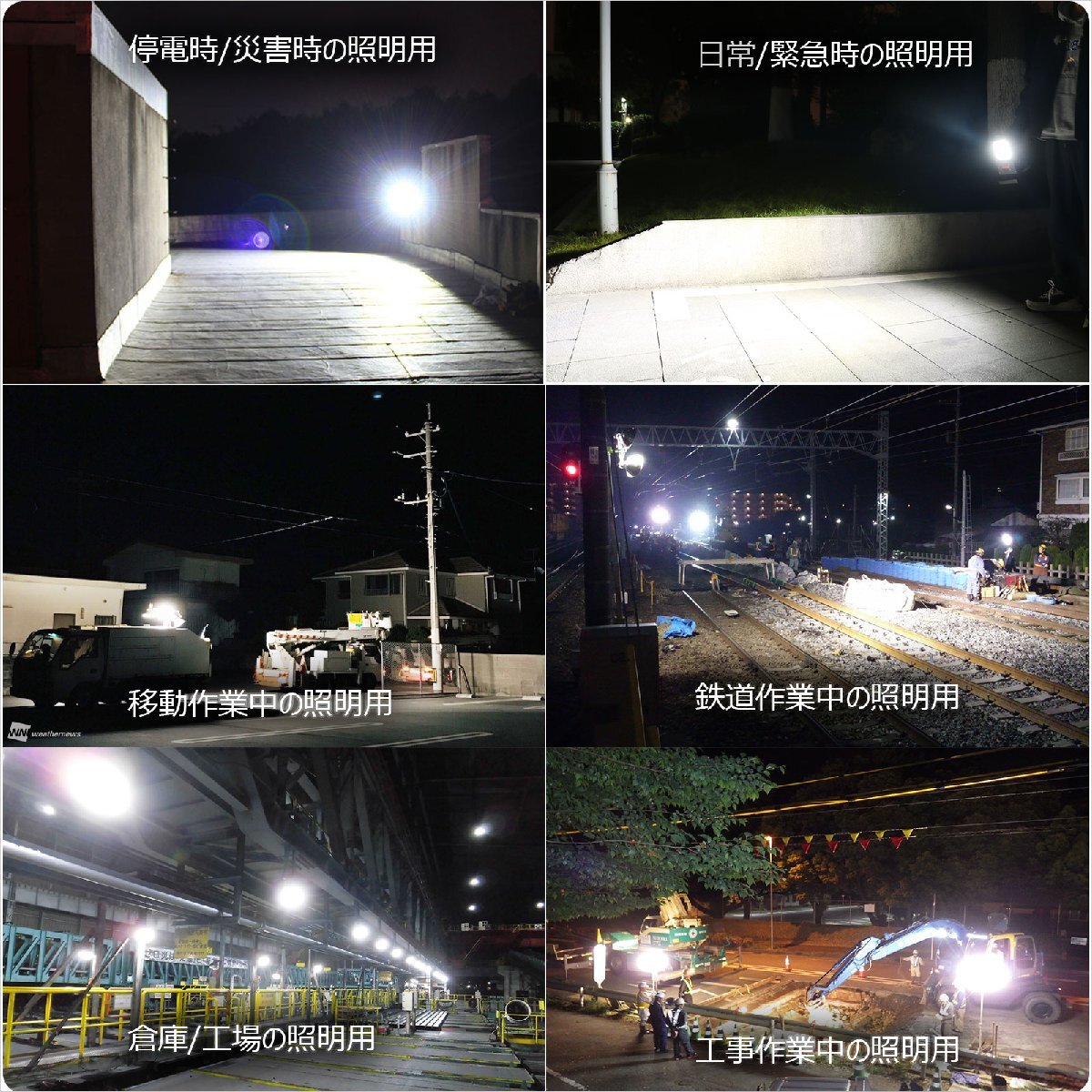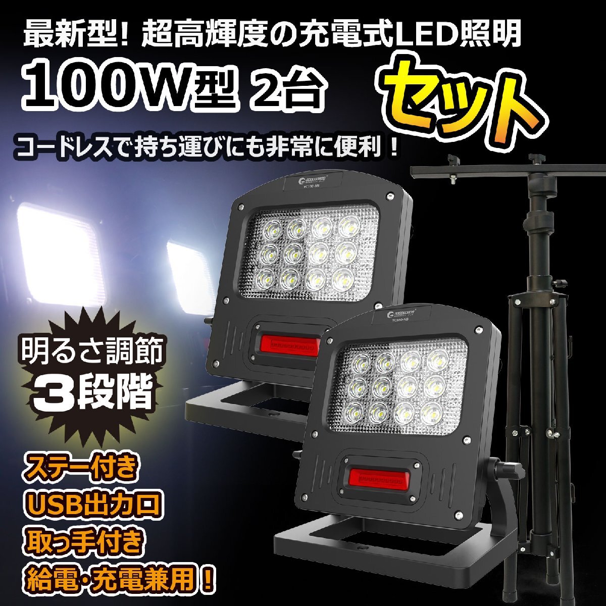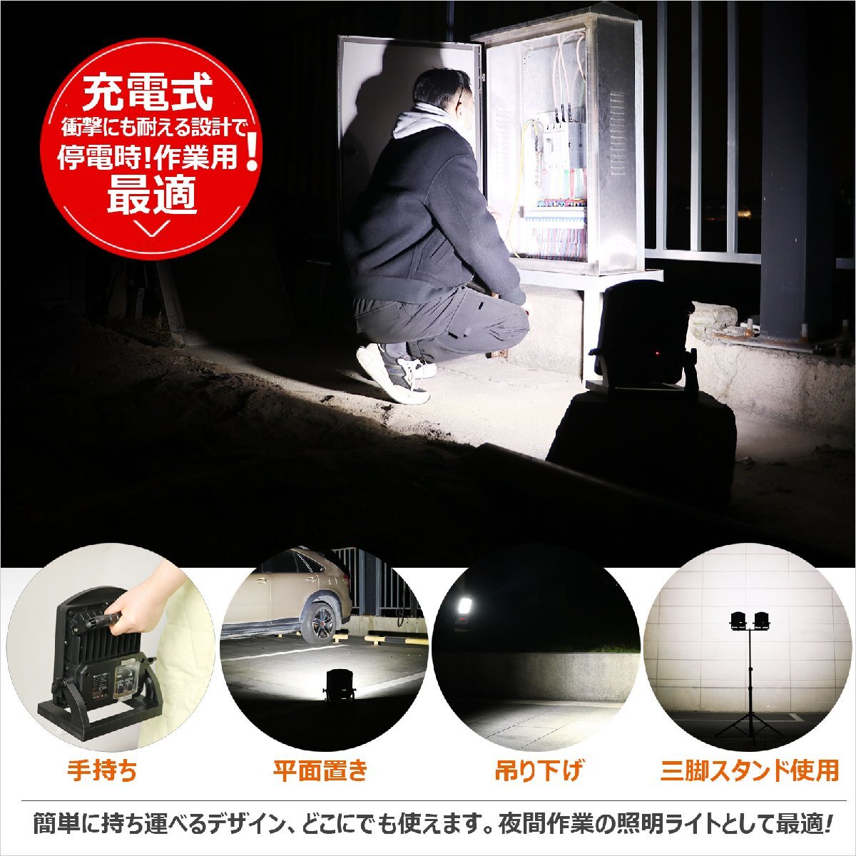| ★オススメポイント★ ・停止表示灯付きLED充電式作業灯 ・充電式・コードレスで電源の取れない場所でも利用できます。 ・100W 11000lmハイパワー!明るさ抜群! 充電時間僅か2時間で満充電! ライトに13.5V/3Aの充電器付属、急速充電を実現しました。 充電/給電兼用 充電バッテリーで点灯の他、ACアダプタを繋いで点灯も可能! USB出力機能 5V 1AのUSB出力・給電機能付き! モバイルバッテリー機能搭載! インスタントオフ機能 点灯後、約5秒経過後は、スイッチを押すとどのモードからでも一回の操作で消灯 防水防塵IP65,防水仕様だから雨の中でも安心! 使用シーン:夜間作業、アウトドア、スポーツ、停電・災害対策など。 更にUSBポートからスマートフォンやタブレットの充電が可能! モバイルバッテリーのように使えるので、アウトドアや防災用品としてもおススメ! 遠くからでも視認性の高い警告灯! 周囲に危険を知らせるため・・・警告灯を搭載。最大50時間点灯! 角度150°調節可能 携帯・USB電源機器に充電可能 1台2役 |