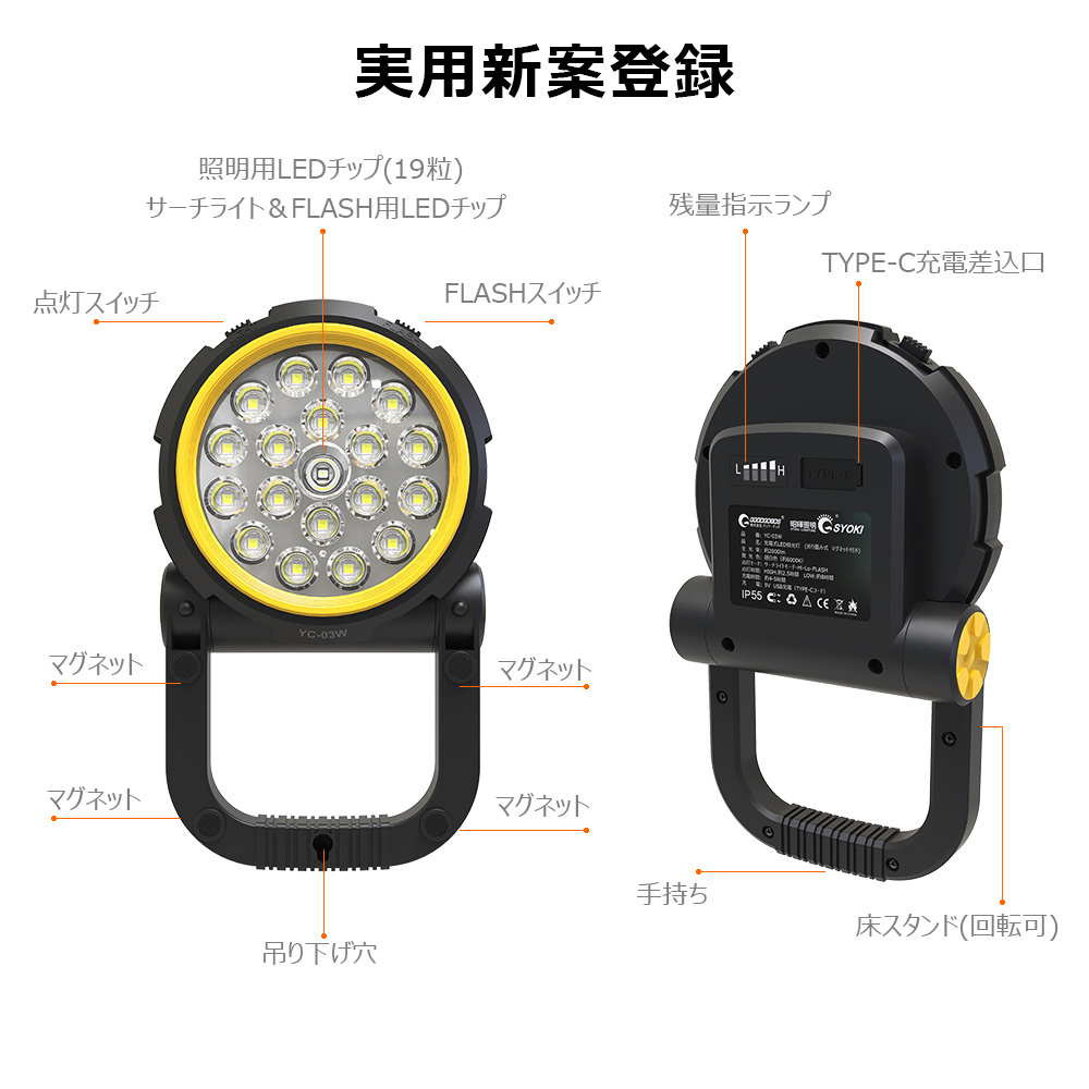 | 商 品 名 | 充電式 ポータブル 投光器 | カラー | イェロー、ブラック |