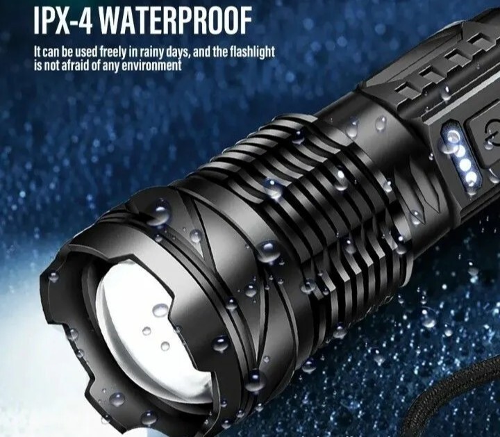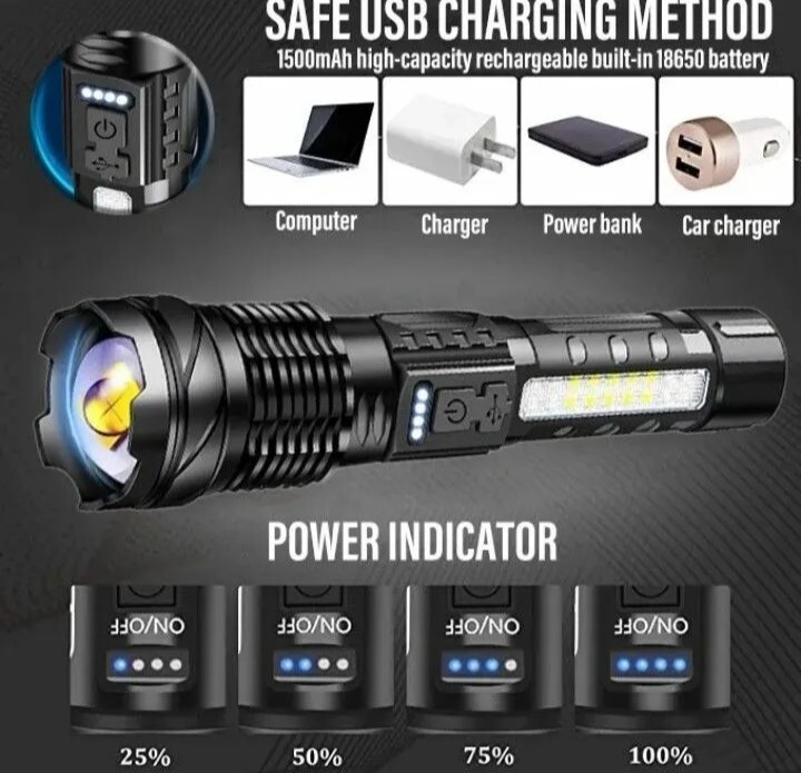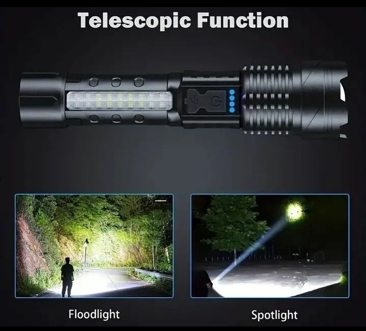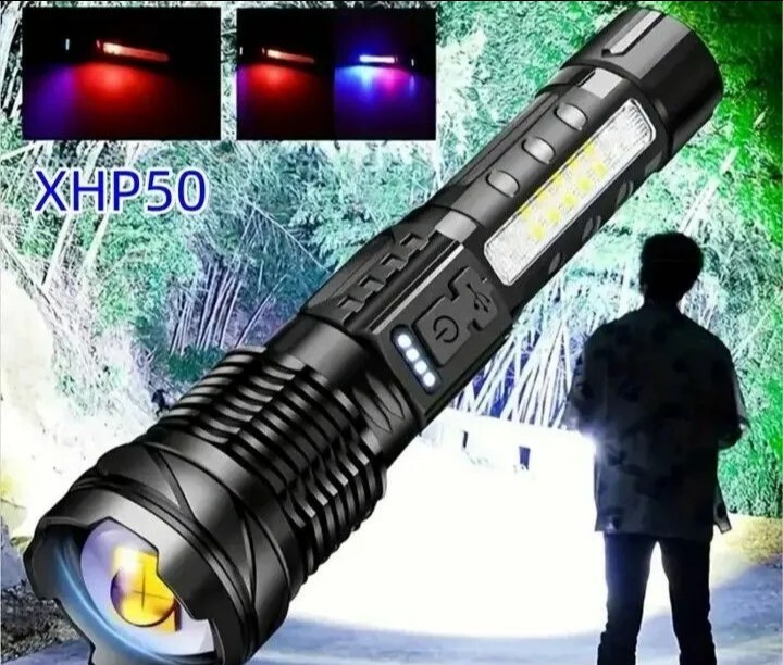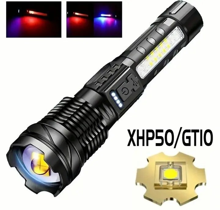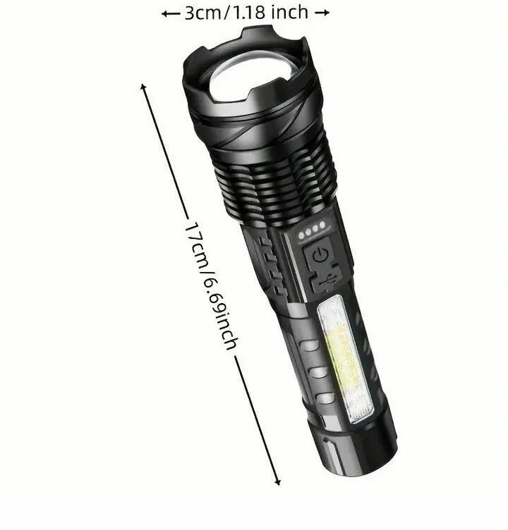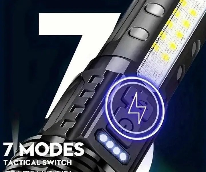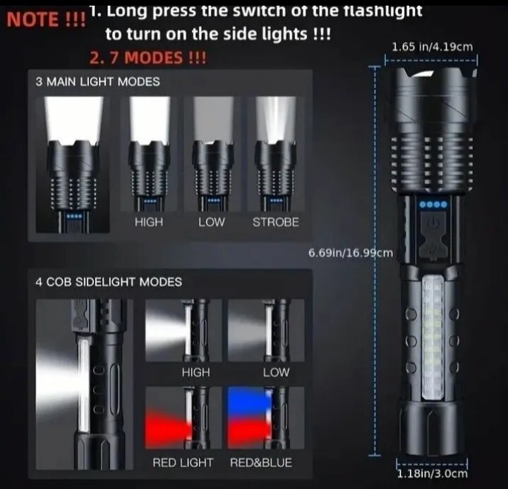 懐中電灯には7つのライトがあり、軽く押すと3つのヘッドライトモードが切り替わります:高輝度-低輝度-SOR点滅-OFF。長押しスイッチでCOB側光の4つのモードに切り替え可能:COB 白色高輝度-低高輝度-赤色光-COB赤+青色フラッシュ-OFF。 様々な状況で使用可能です。