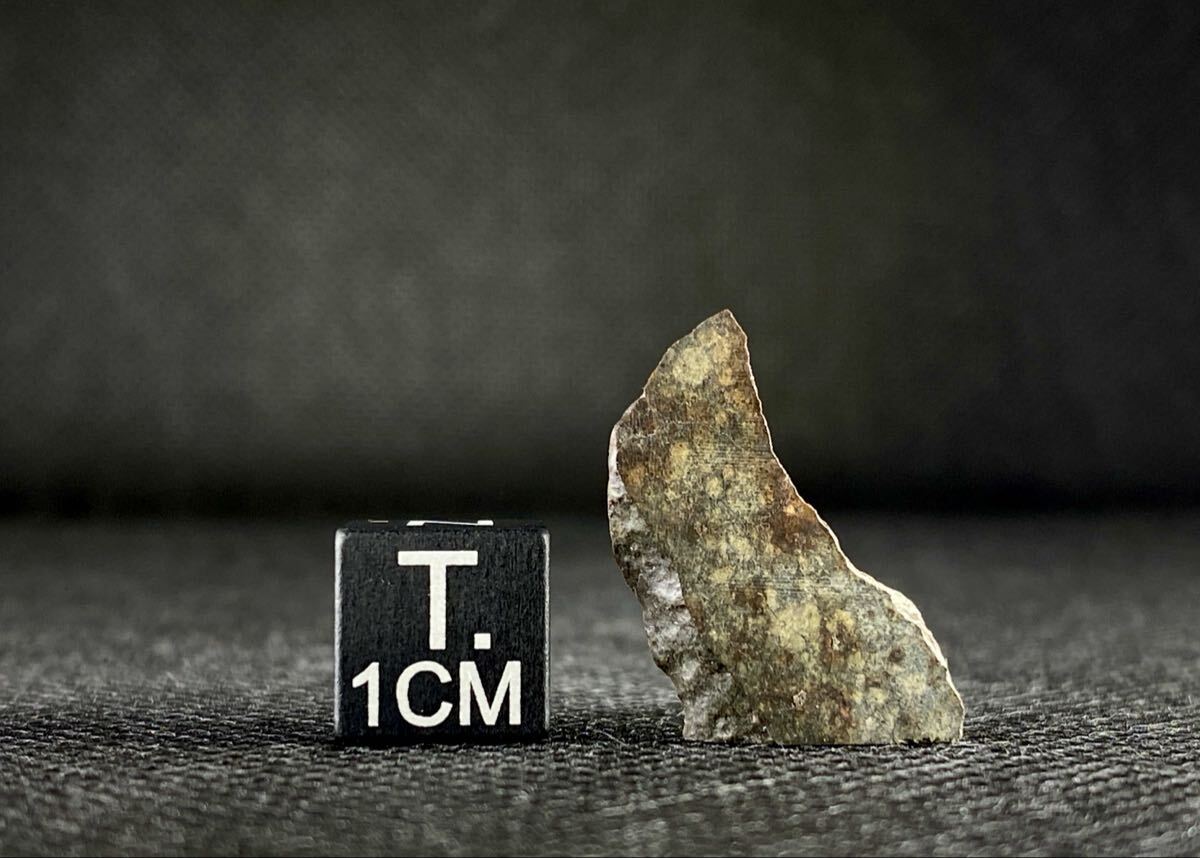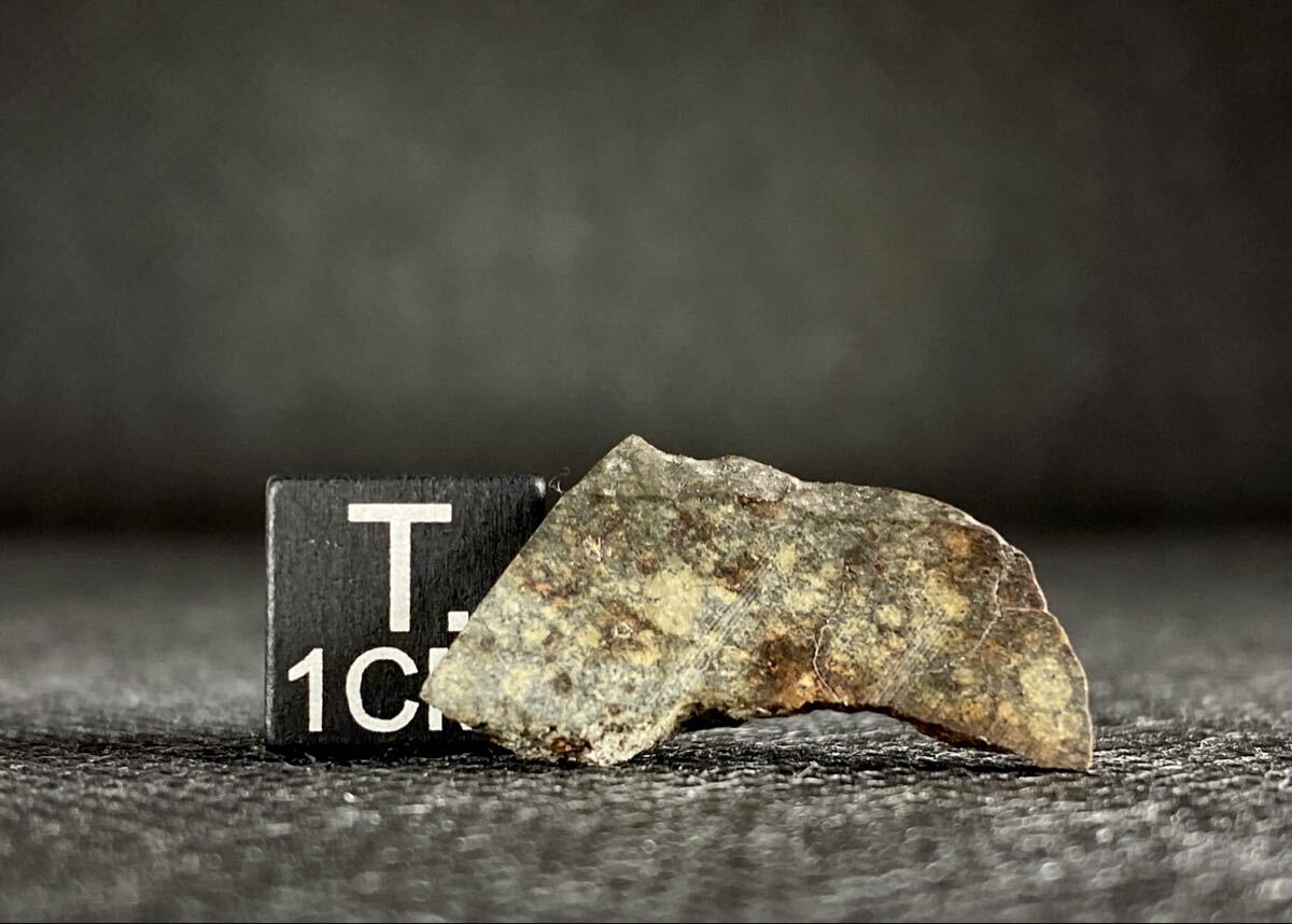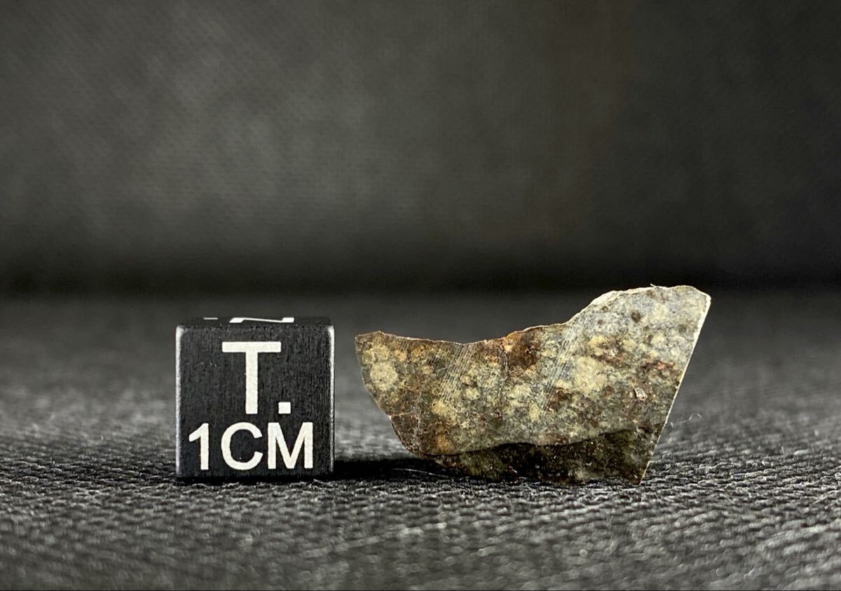 灰色マトリックスに白色っぽいコンドリュールや、焦茶色に染まった様なコンドリュールが観察出来、外側の光沢のある表皮も神秘的です。