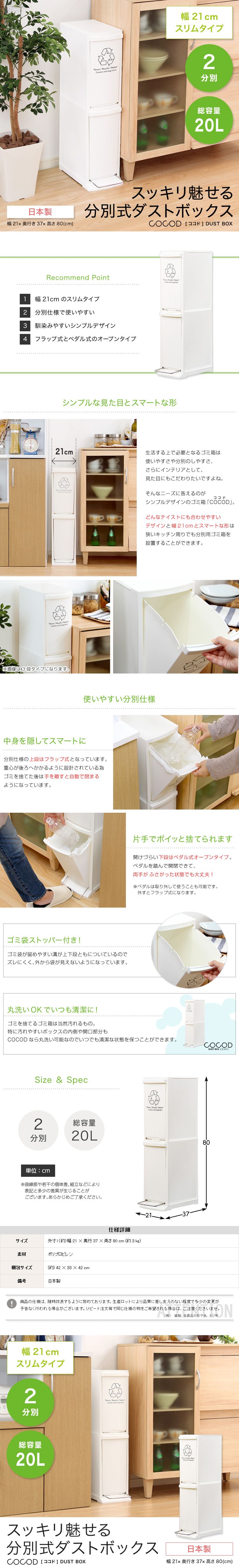 | 【ポイント】 フラップ式とペダル式のオープンタイプのダストボックスです。 分別仕様で使いやすく、幅21cmのスリムでシンプルなデザインです。 安心の日本製!カラーは清潔感のあるホワイトです。 |