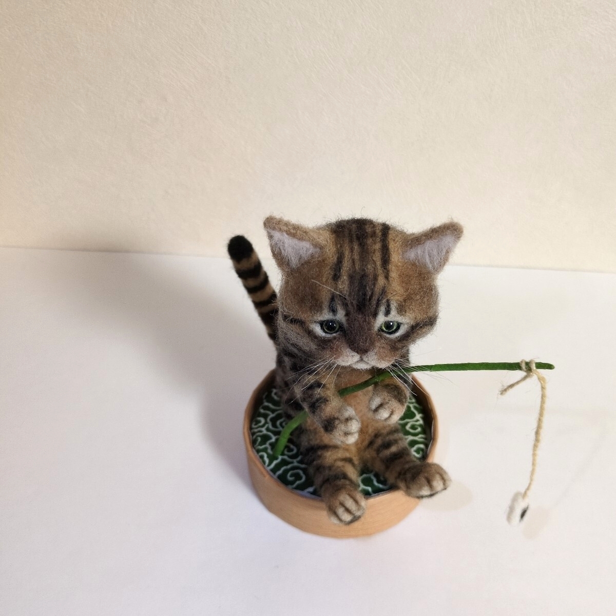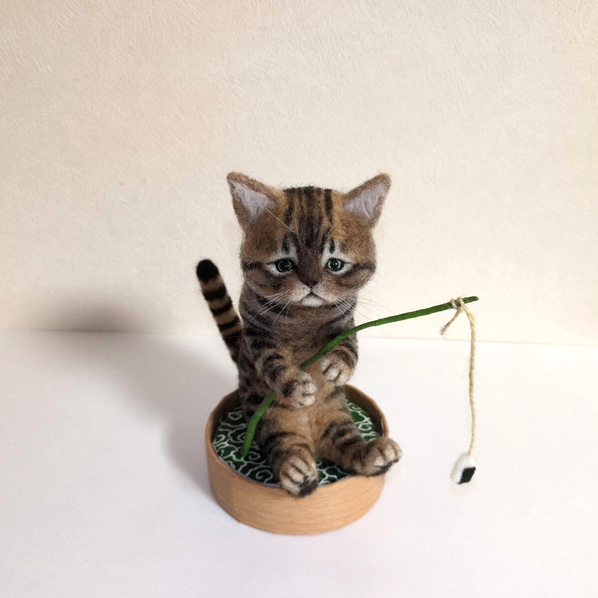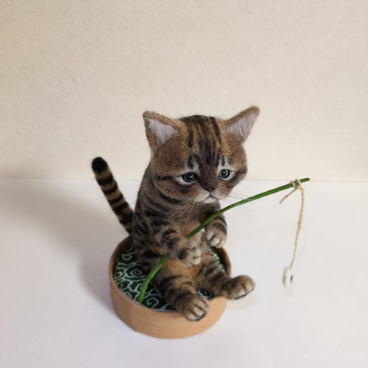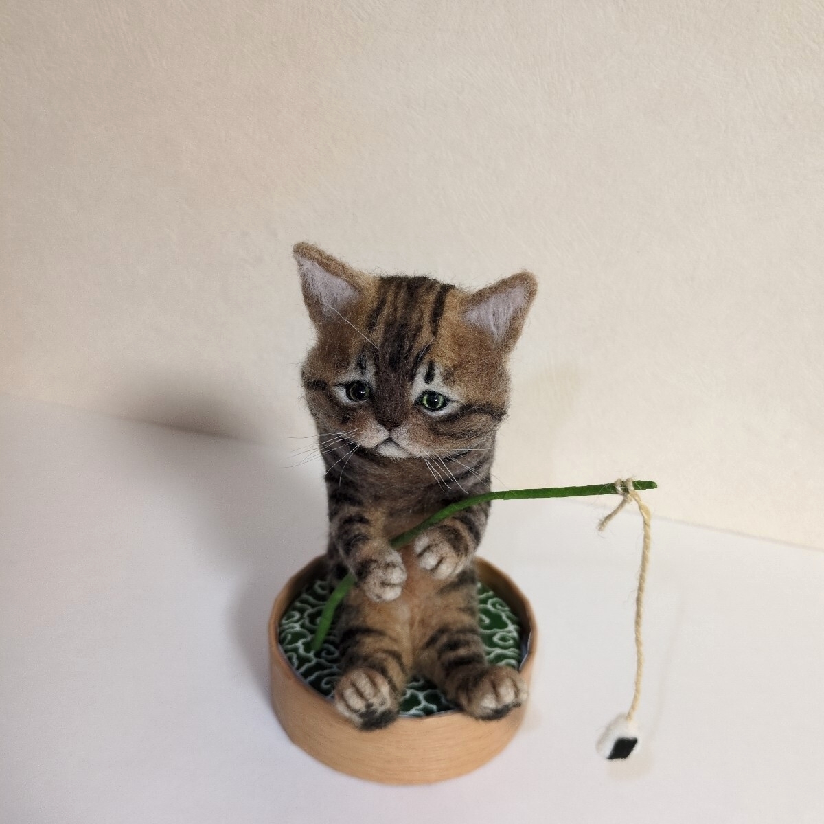 ◇羊毛フェルト等でつくりました「釣りをするネコ」(キジトラ)をイメージした作品です。