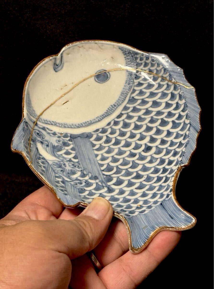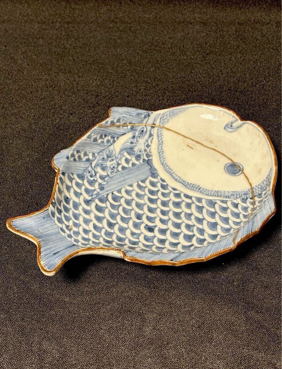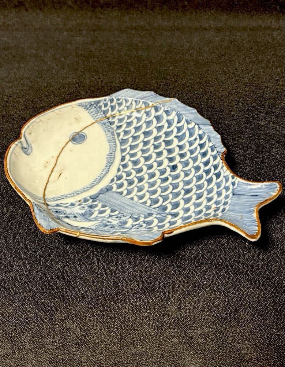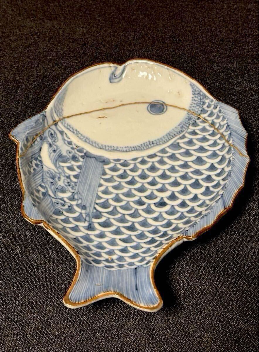 江戸前期の古九谷期藍九谷の魚型の中皿です。1660〜80年くらいのものだと思います。ご存知のことと思いますが、藍九谷の魚型は非常に珍しいと思います。写真でおわかりのように金直しされていますが非常にいい本金直しが施されています。絵付けも精緻で厚めの生地で生掛けの艶めかしさと相まって雅味を感じます。サイズは高さ2.8、口径16.8×13、高台8.1センチくらいです。また最後の写真にありますように『部屋いっぱいに和骨董インテリア』(成美堂出版)に現品が掲載されています。ご落札者様にこの書籍もセットでお送りさせていただきます。この機会にいかがでしょうか。当方酒器を中心に出品しております。よろしければ出品者の他の出品もご覧ください。発送はヤマト便で行わせていただきます。送料は一律800円(沖縄1500円、北海道は1200円、離島は1800円)です。ご不明な点はご質問欄よりお気軽にお問い合わせください。