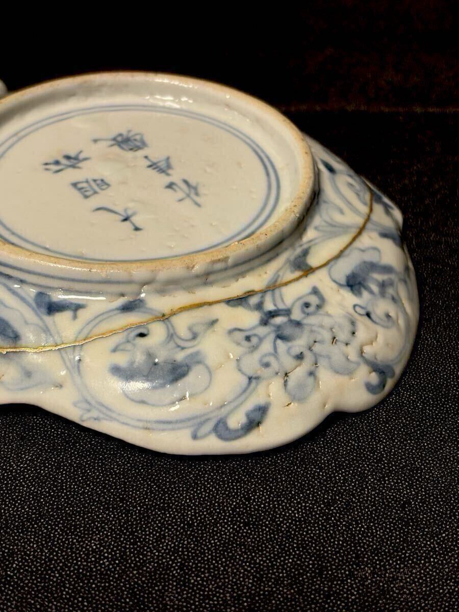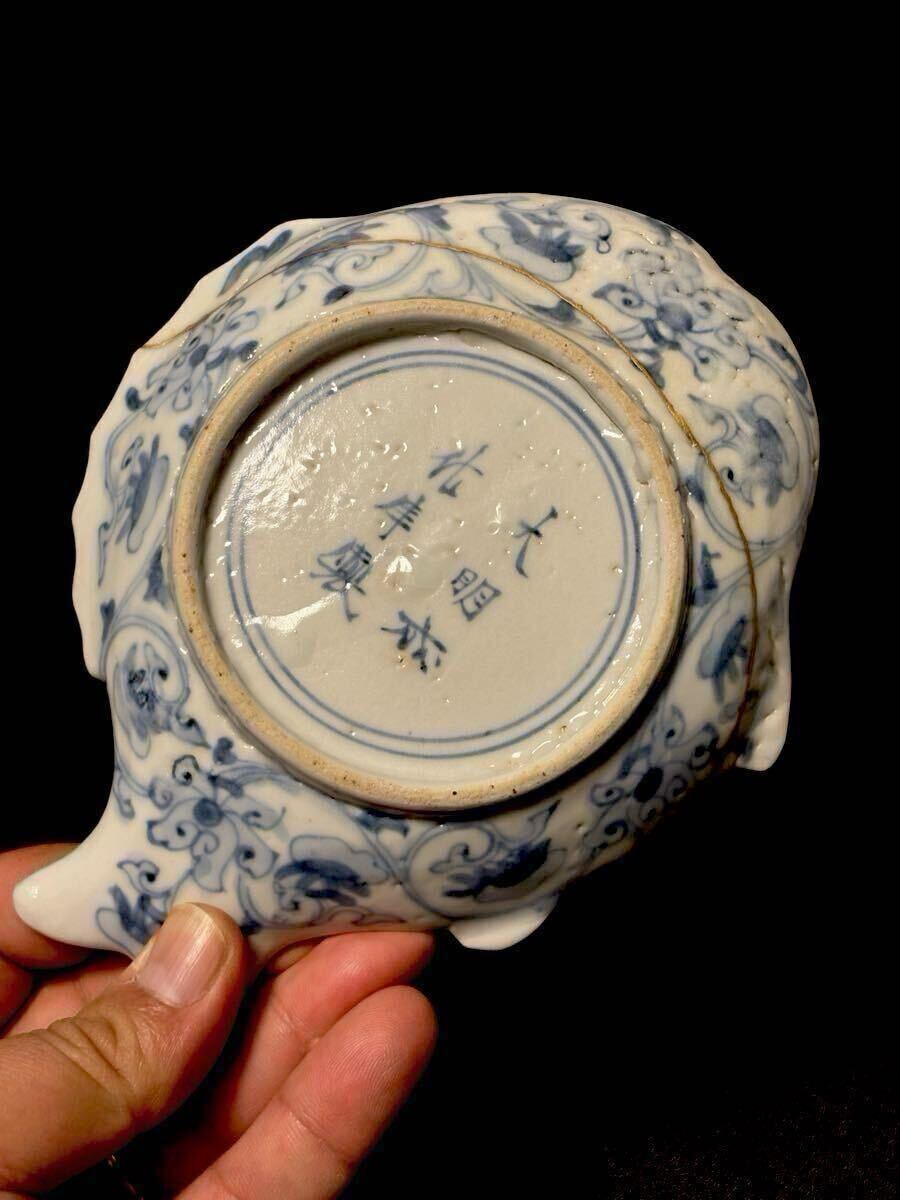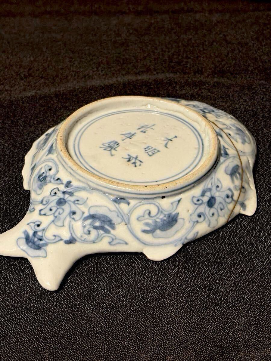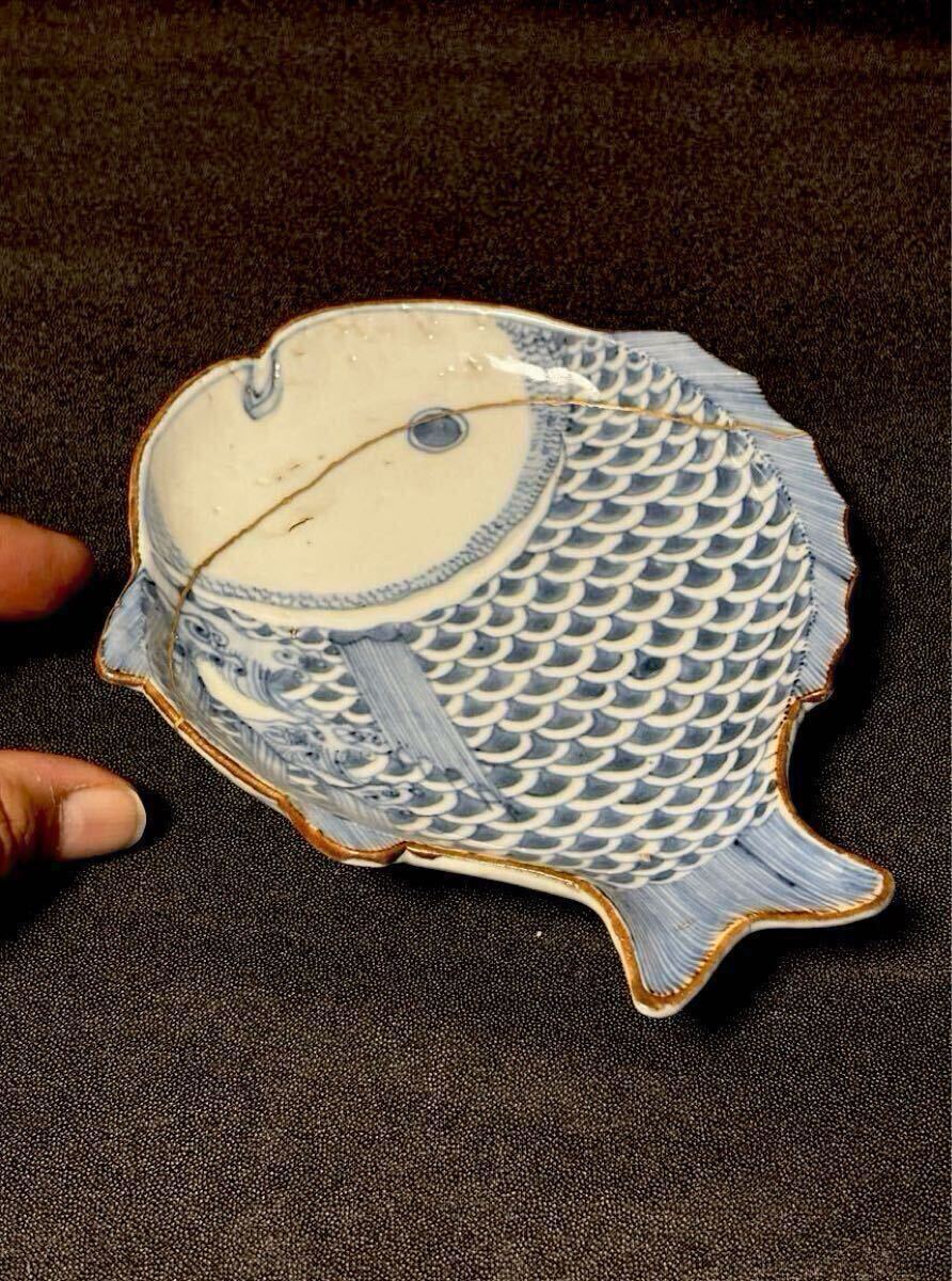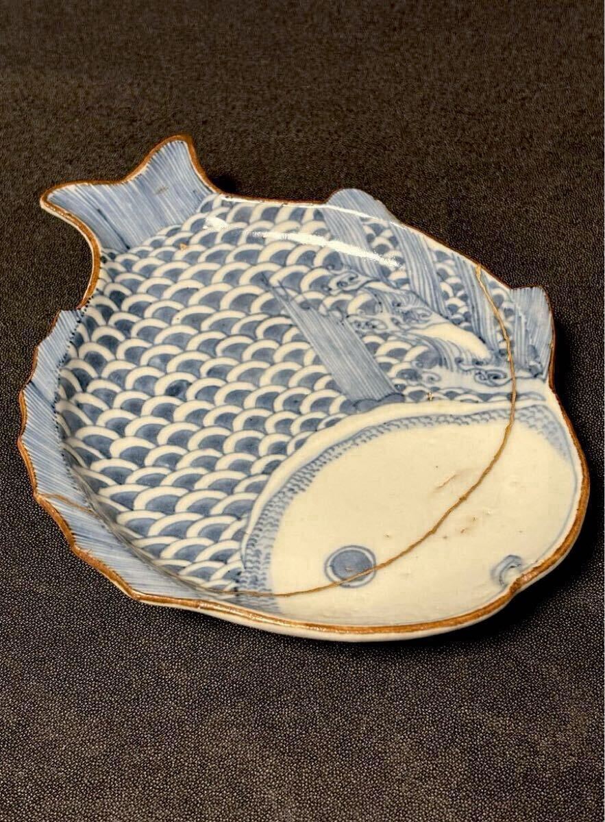 江戸前期の古九谷期藍九谷の魚型の中皿です。1660〜80年くらいのものだと思います。ご存知のことと思いますが、藍九谷の魚型は非常に珍しいと思います。写真でおわかりのように金直しされていますが非常にいい本金直しが施されています。絵付けも精緻で厚めの生地で生掛けの艶めかしさと相まって雅味を感じます。サイズは高さ2.8、口径16.8×13、高台8.1センチくらいです。また最後の写真にありますように『部屋いっぱいに和骨董インテリア』(成美堂出版)に現品が掲載されています。ご落札者様にこの書籍もセットでお送りさせていただきます。この機会にいかがでしょうか。当方酒器を中心に出品しております。よろしければ出品者の他の出品もご覧ください。発送はヤマト便で行わせていただきます。送料は一律800円(沖縄1500円、北海道は1200円、離島は1800円)です。ご不明な点はご質問欄よりお気軽にお問い合わせください。
