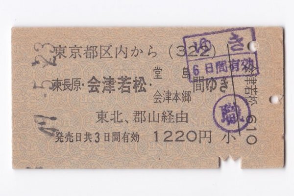 ●国鉄●コード(322) 東京都区内から東長原・会津若松・堂島・会津本郷 間ゆき 東北、郡山経由 A型券 昭49年 赤羽駅発行【9472】