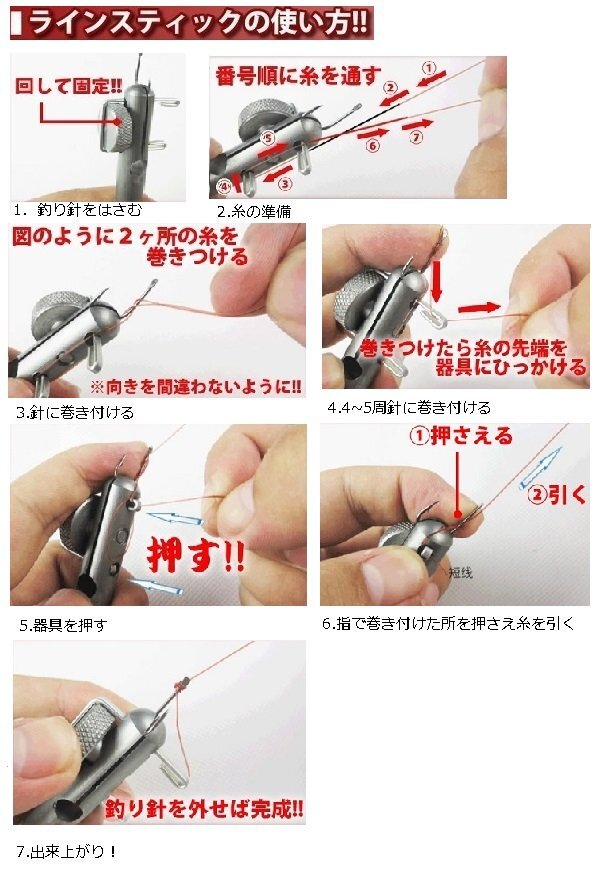 ★ 釣りにはとっても便利なアイテム!! ★ 釣りには絶対の技術、釣り針に糸を結ぶ事がラクにできる!! ★ 初心者はもちろん、上級者も釣り具ケースに忍ばせておけばお役に立ちます!! ★ コンパクトなので道具が多くなる心配もなく、あなたのフィッシングをサポート!! |