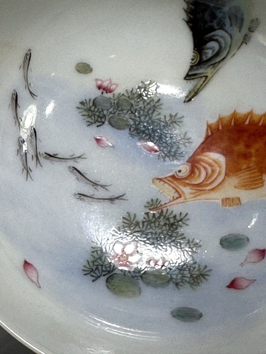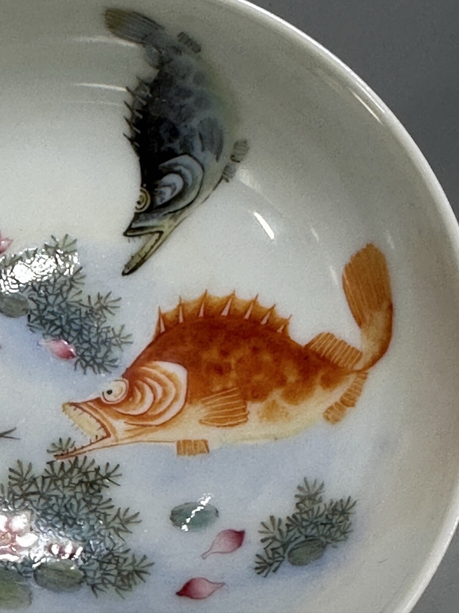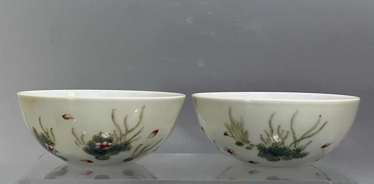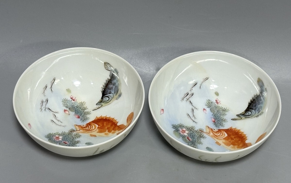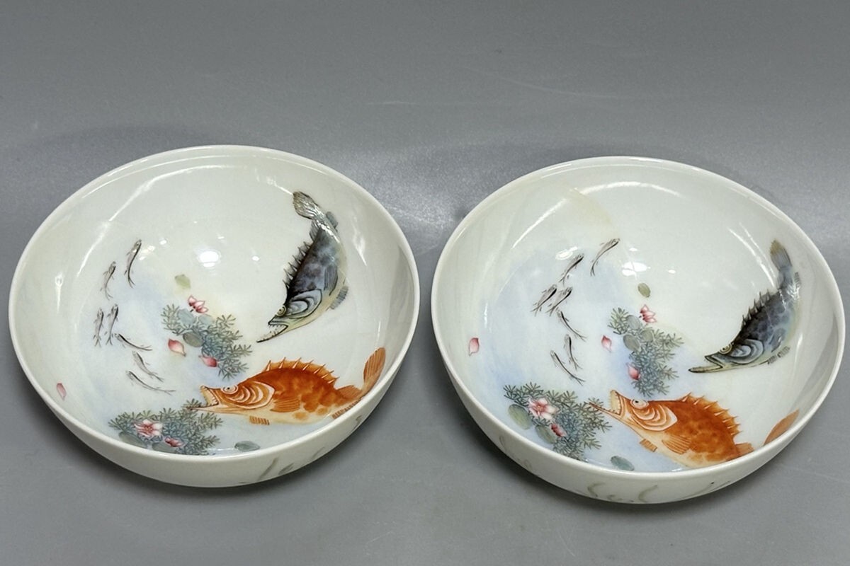 「清 雍正年製 陶磁器 琺瑯彩年年有魚紋 杯一対」染付 置物 擺件 古賞物 中国古美術 旧蔵出